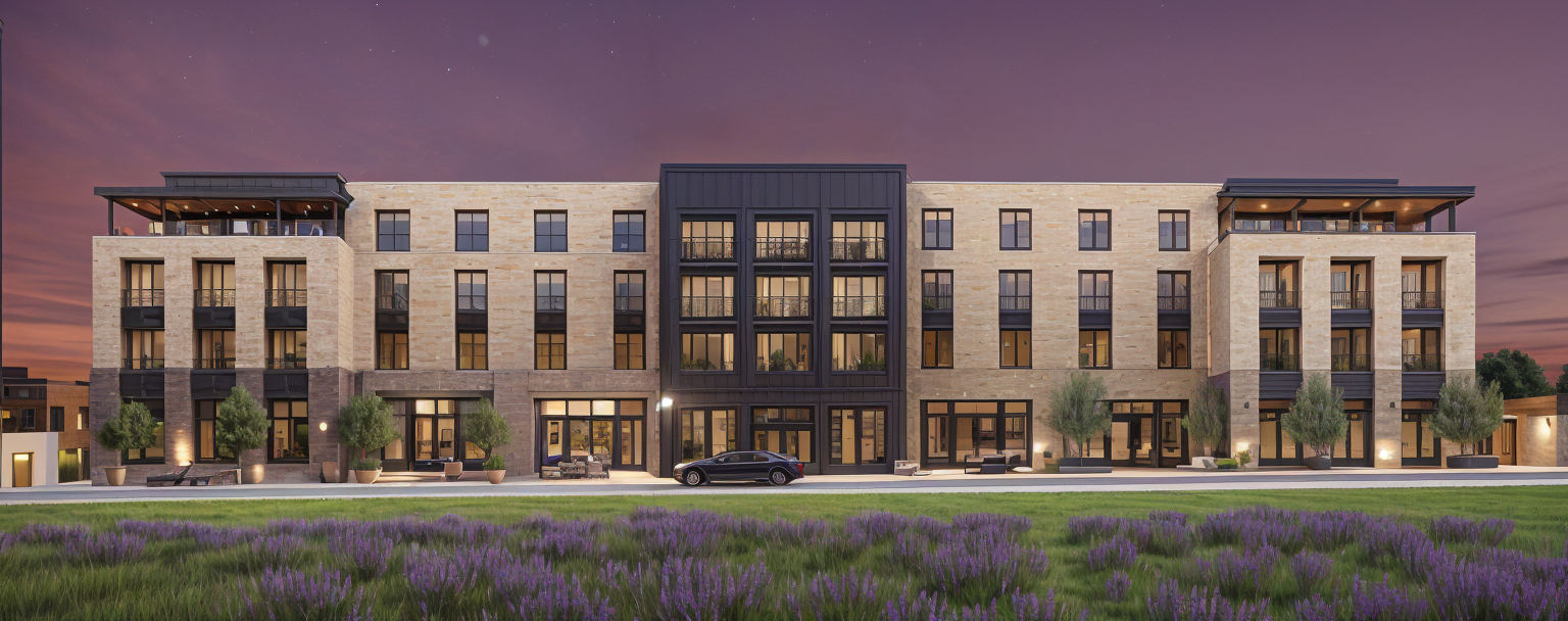a industrial hotel in fort worth texas plaster and stone walls steel framed windows strong geometric forms rooftop terraces with greenery symmetrical fa ade and dramatic nighttime architectural lighting western traditional design architecture