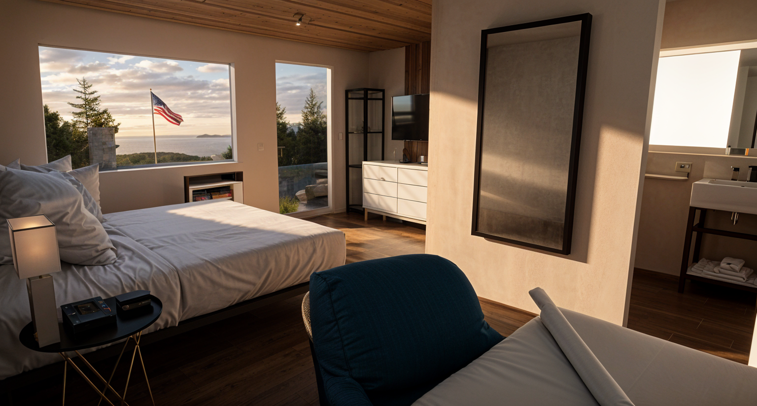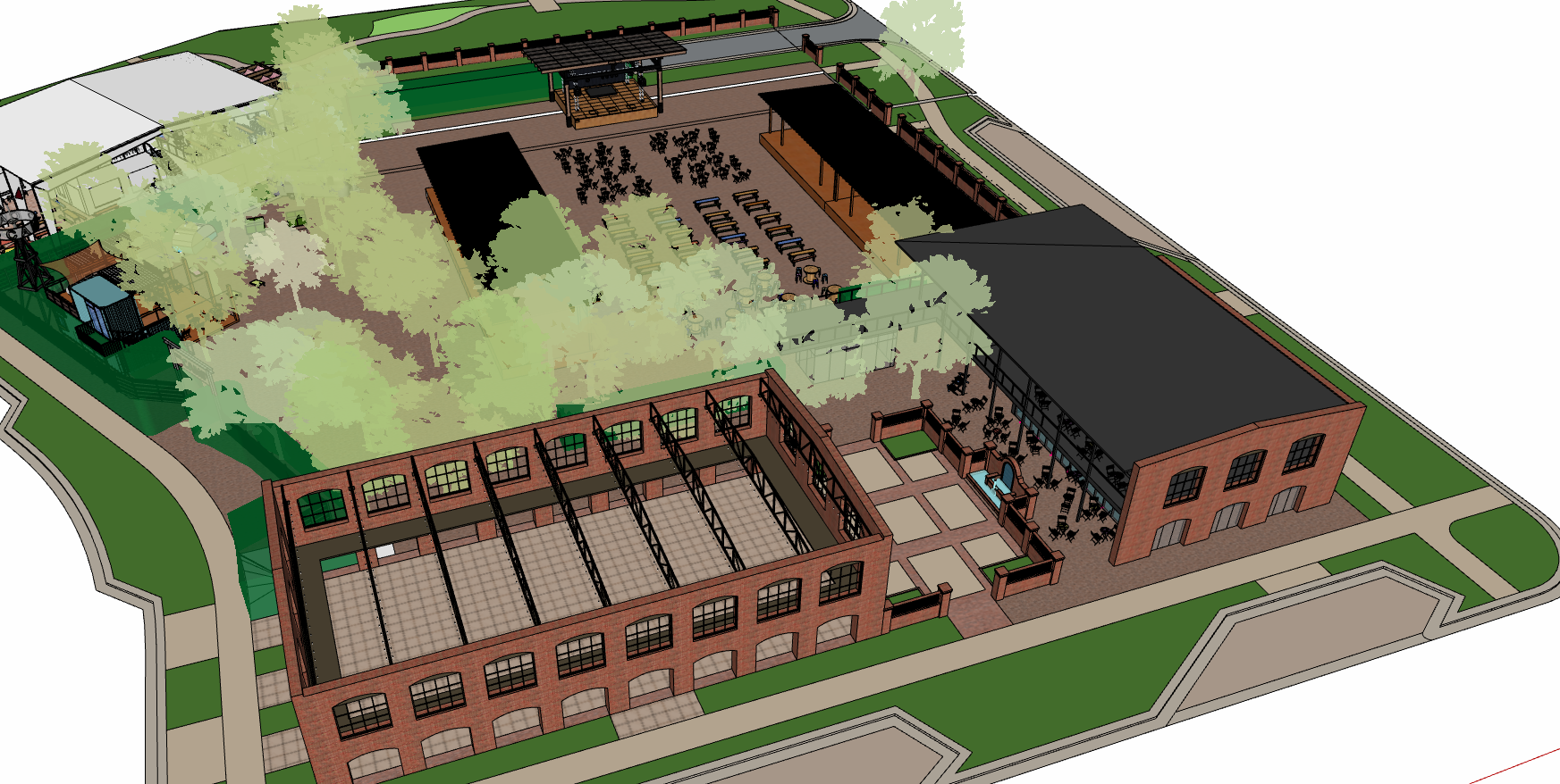 make this a photorealistic architectural rendering with small uplighting at the base of the buildings make the stage at the top of the image wider