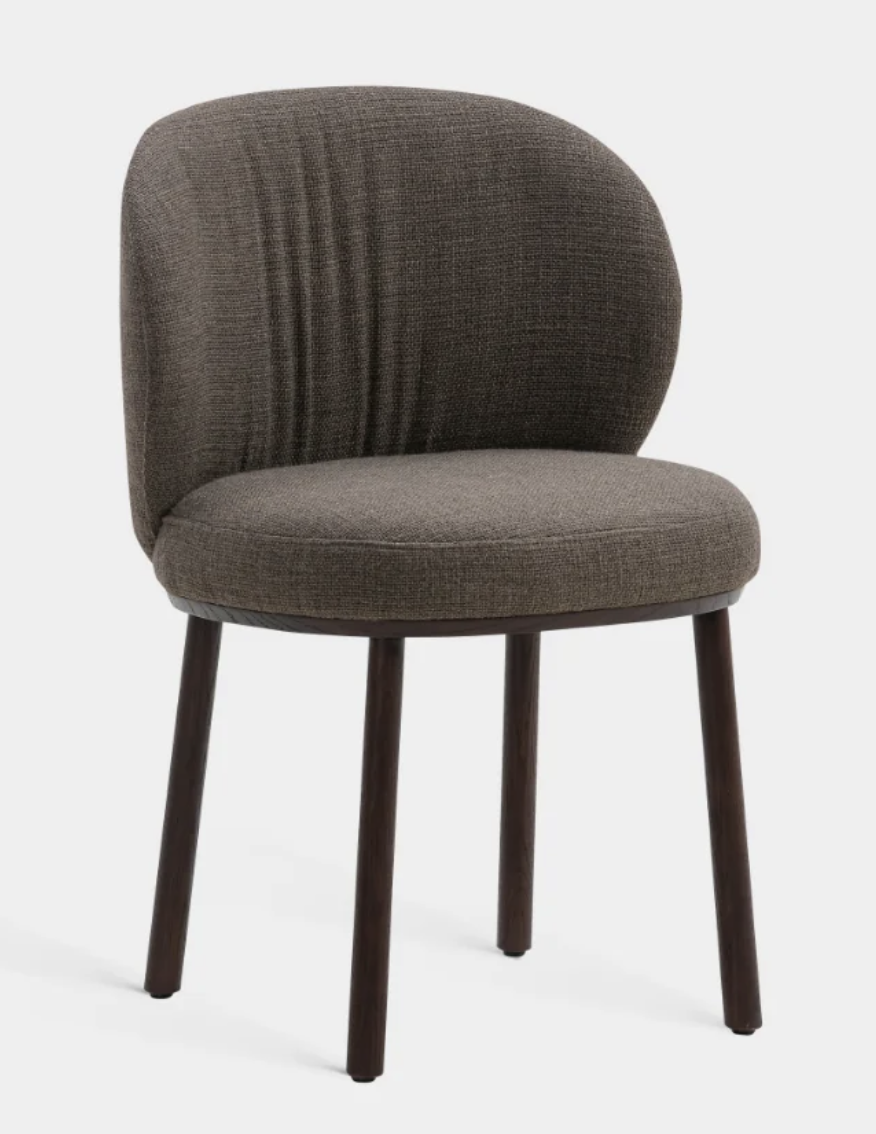 stoffeer deze stoel in een beige boucle stof het onderstel is donker gebeitst eikenhout
