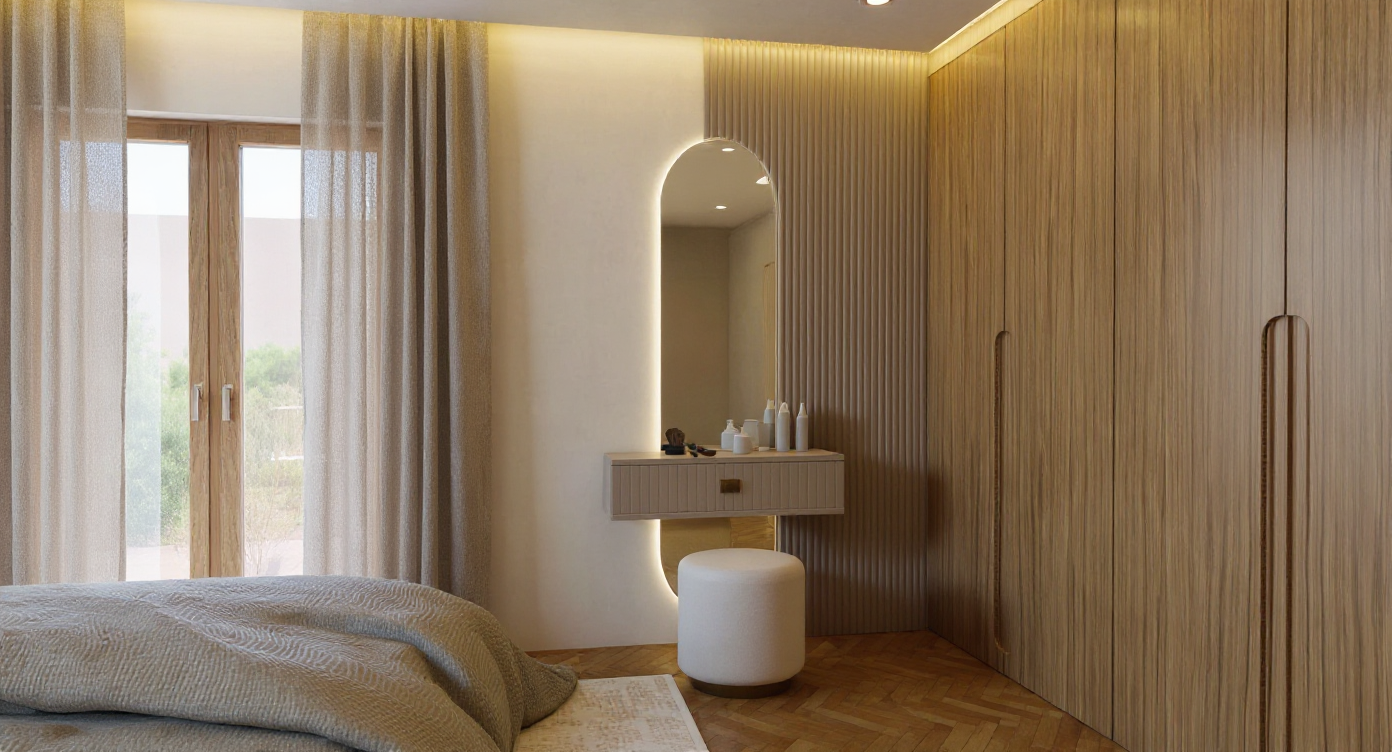 ultra photorealistic interior visualization based on the provided 3d render preserve the exact geometry materials furniture finishes colors textures and artificial lighting setup with absolute accuracy enhance the scene with natural daylight entering through the existing windows on a bright clear day with soft neutral sky conditions daylight should be realistic balanced and physically accurate gently interacting with surfaces without overexposure or color distortion maintain the original interior mood while adding subtle daylight shadows natural reflections and soft light gradients on walls floors and furniture no changes to room layout furniture position or material selection apply very small refined design enhancements only improved light balance and shadow softness slightly enhanced material depth and realism minimal styling refinements that elevate the space without altering its identity photographic realism professional interior photography look natural color grading real world exposure sharp details no stylization no artistic exaggeration do not change furniture design scale or position do not replace materials or finishes no new furniture no layout modifications no exterior scenery emphasis no dramatic lighting no golden hour no sunset no cinematic effects no filters no artistic style no people no clutter no unrealistic reflections