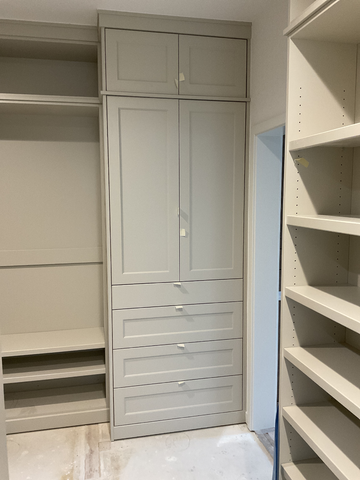 do not change the cabinets in any way preserve the exact cabinet colors materials finishes dimensions door and drawer styles hardware spacing alignment and all geometry exactly as shown do not alter the countertop shape backsplash appliances flooring lighting fixtures or wall structure only remove the construction materials clutter and mess from the scene clean the room and make it look finished and staged add a few simple tasteful home accessories appropriate for the style of the space but do not add or remove any furniture windows or architectural elements maintain the original lighting direction and realism enhance clarity and polish the photo while keeping the cabinetry and room design completely unchanged do not alter the lighting to keep the cabinet colors as they are in the image add carpet add brushed nickel cabinet pulls to the door and drawer fronts stage for a luxurious closet