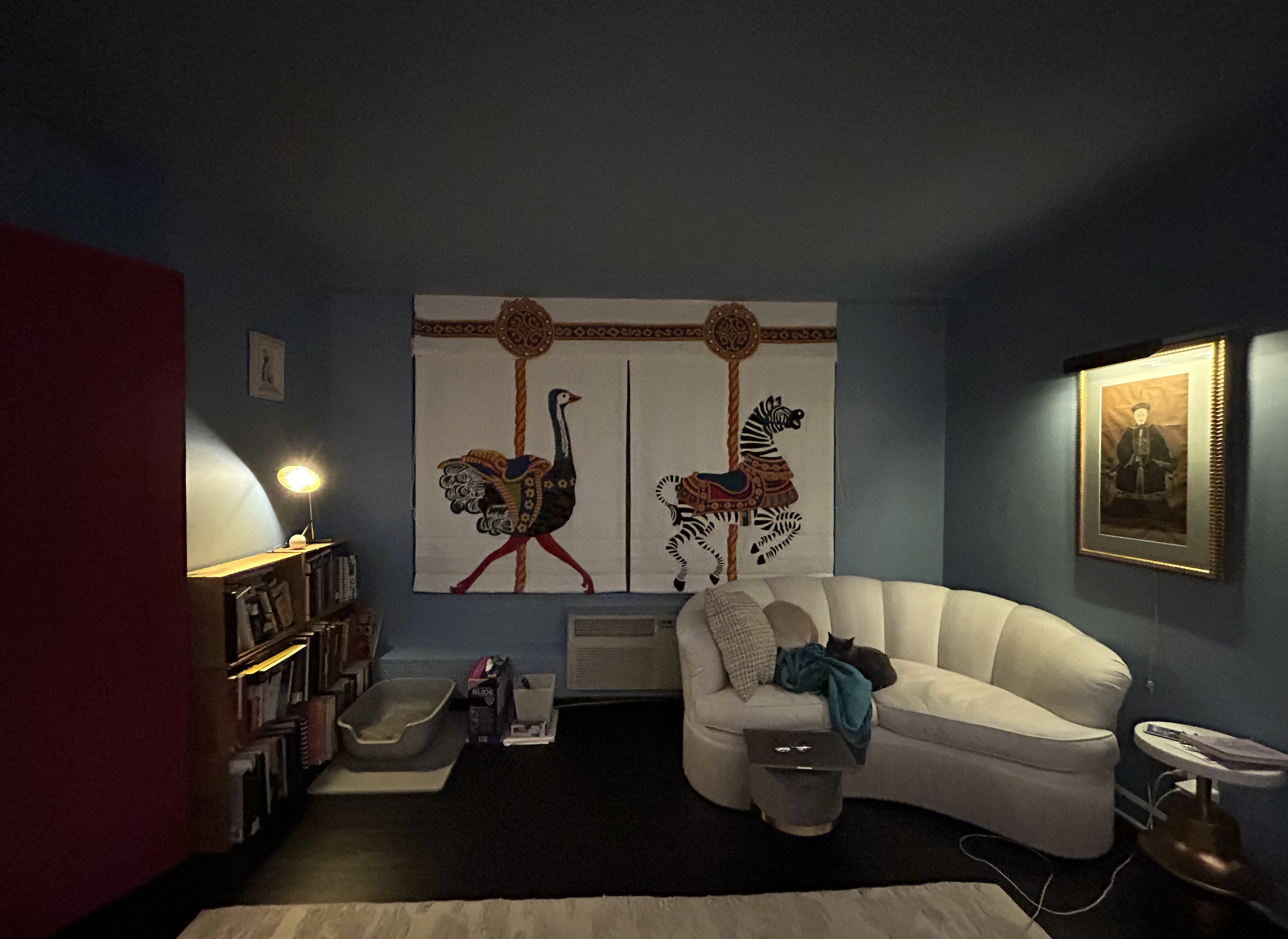 render the walls and ceiling a dark teal almost black and the sofa in a dark emerald velvet green