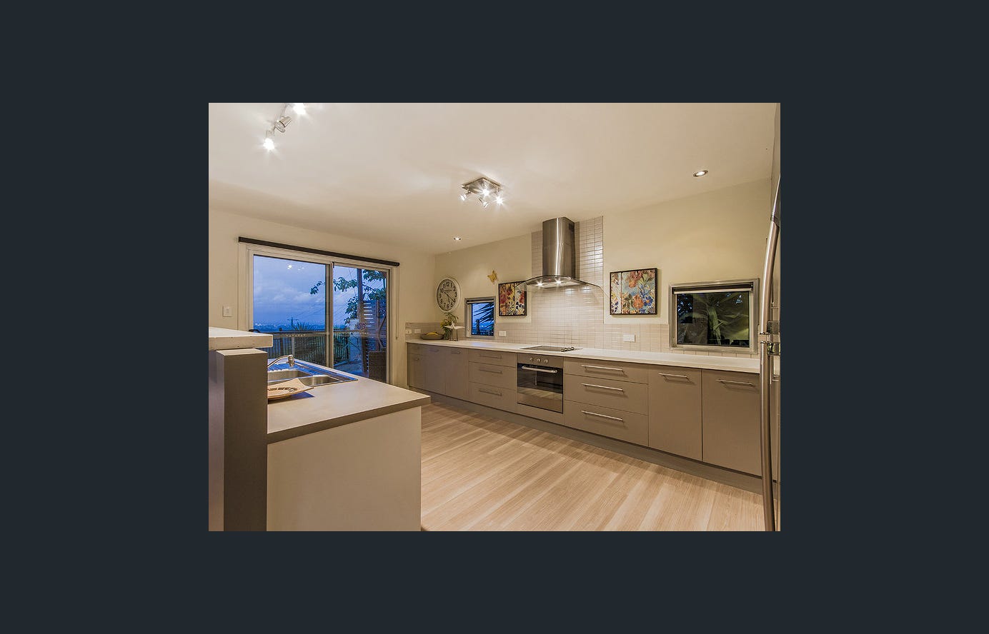 recreate this image with hamptons style inspiration with walnut timber floors shaker cabinets in white change the island to be more hamptons style replace artwork place upper cabinets and a stone countertop that wraps up the wall covering the windows add arched french doors to outside cover the hood
