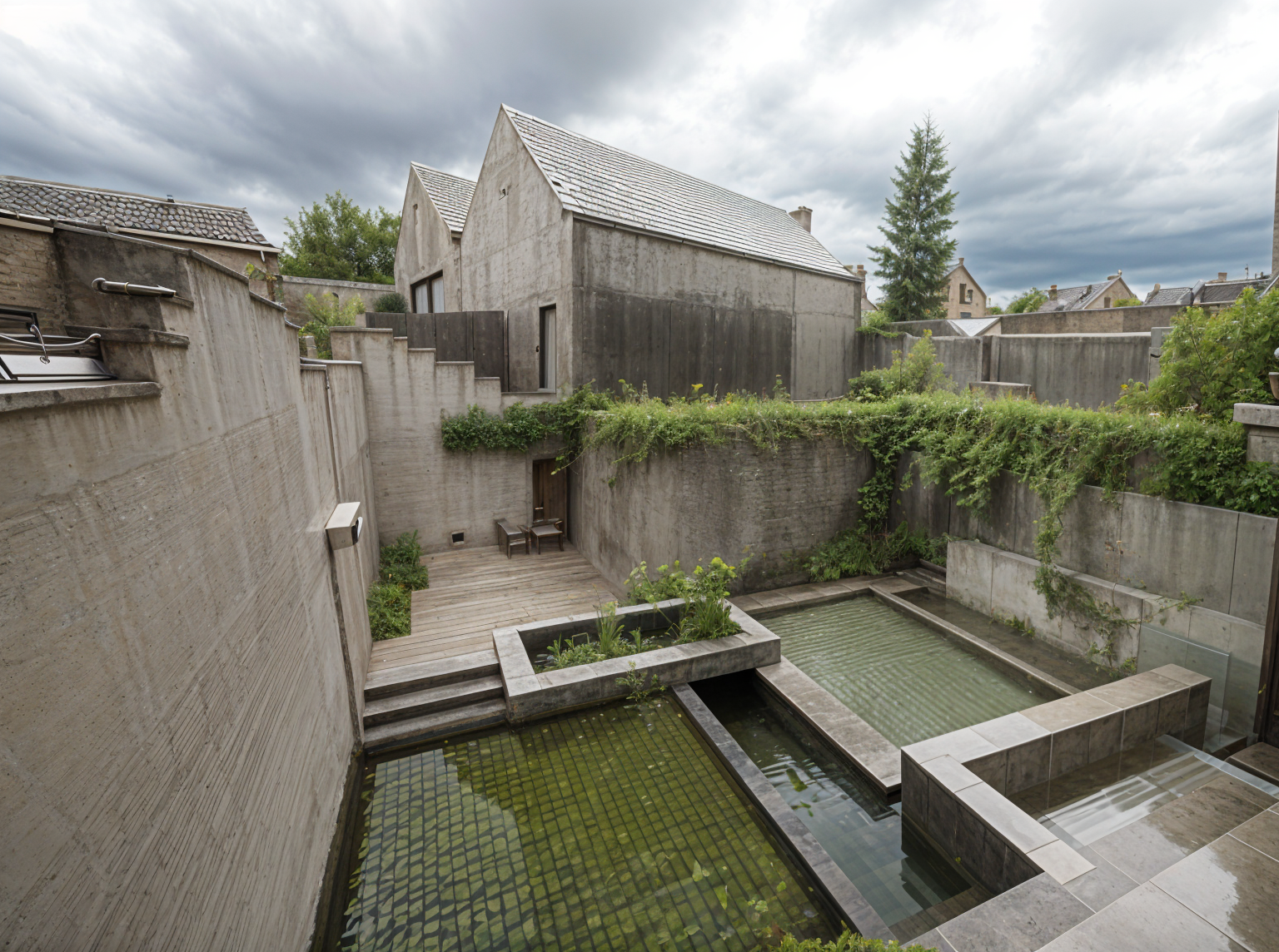 exterior shot make it more realistic light gravel up to the concrete platting the concrete in the top left corner is a stair that follows the terrrain architecture