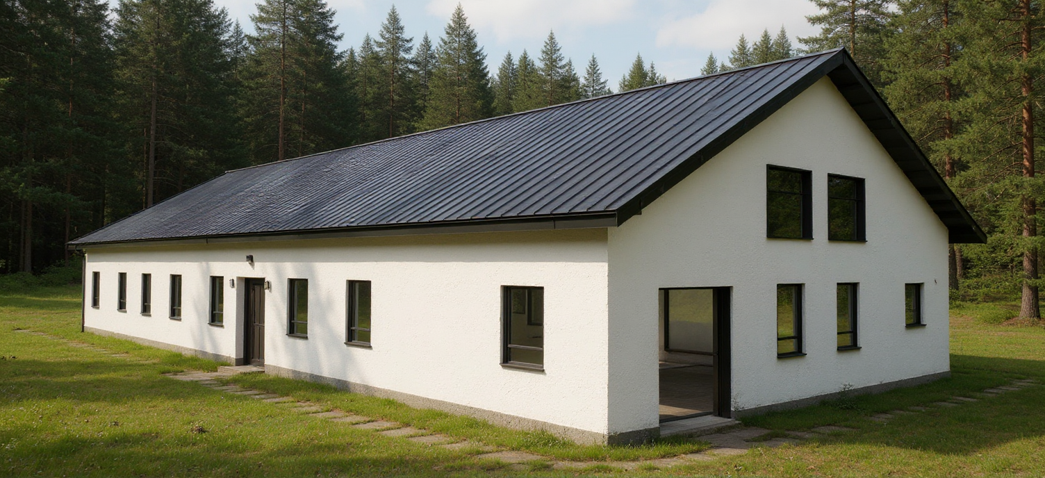 luxury modern french home with french doors on left wall leading to a terrace with a view la hills and right foyer sofa table behind each sofa with floor lamp on each side have all lights glowing on scale furniture