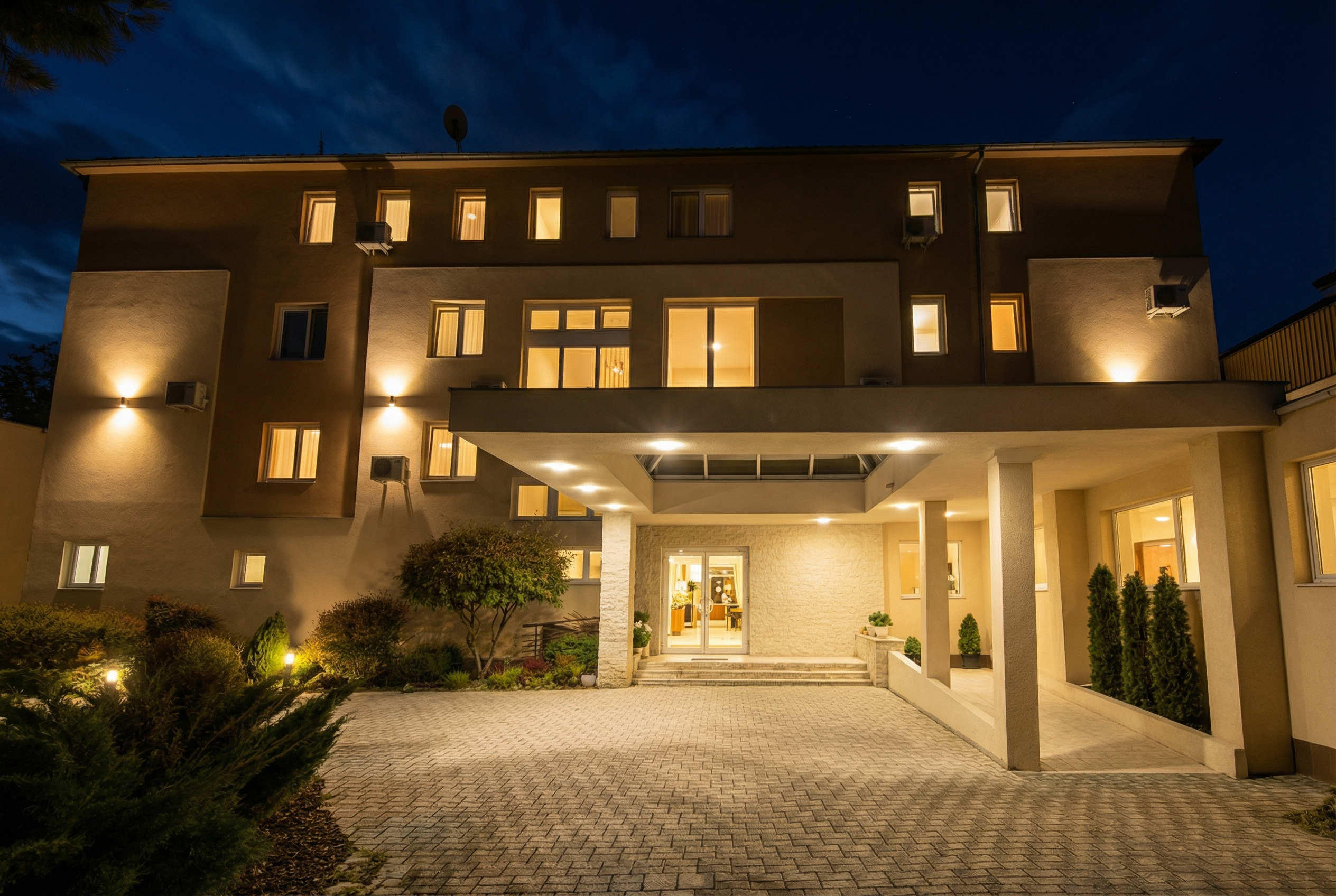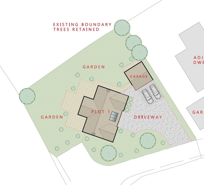 create an elevation showing a single detached red brick house the roof should be a pitched roof over a cruciform footprint each projecting wing has a hip roof sloping toward the external walls and the roof planes intersect to form valleys where the wings meet the centre forms a cross shaped valley junction include a rectangular rooflight on one roof plane roof pitch is consistent across all planes the house should have a gravel driveway and red brick brick garage it should have a lightly landscaped garden