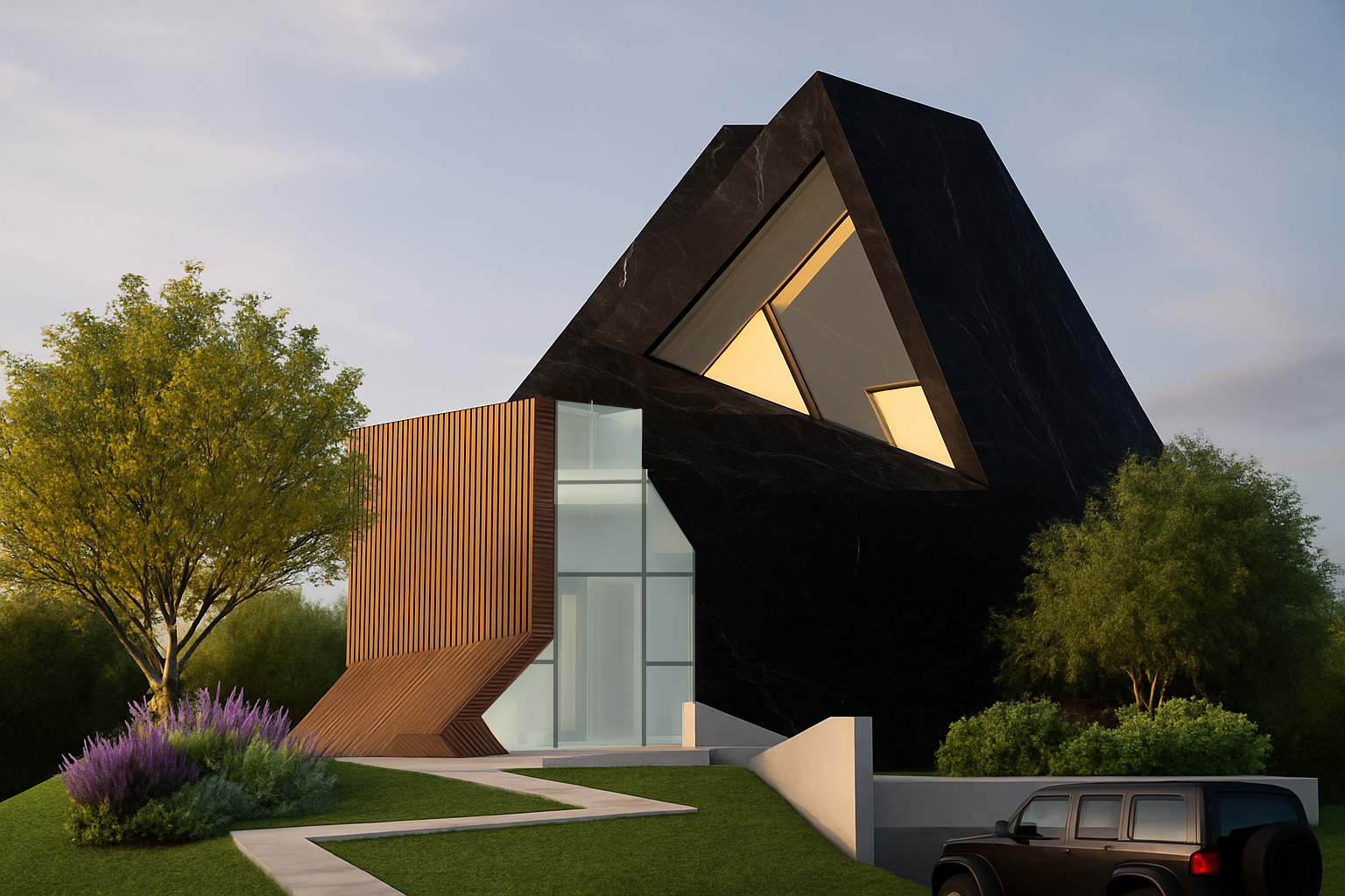 exterior shot exterior shot apply soft daylight with slight haze desaturated earthy tones and a cinematic mood emphasize minimalist composition muted colors and flat entourage silhouettes that blend graphically into the scene reduce hyper real reflections and glossiness adding subtle film grain for a photographic feel final image should feel like a conceptual architectural visualization calm atmospheric and editorial add hyperrealistic shadows