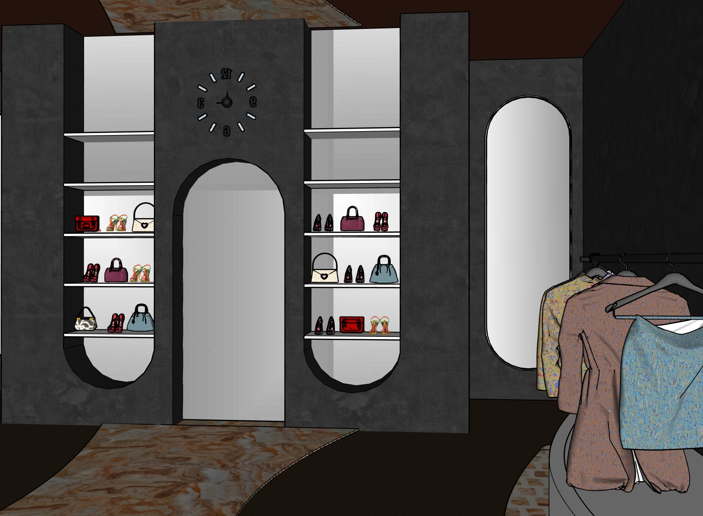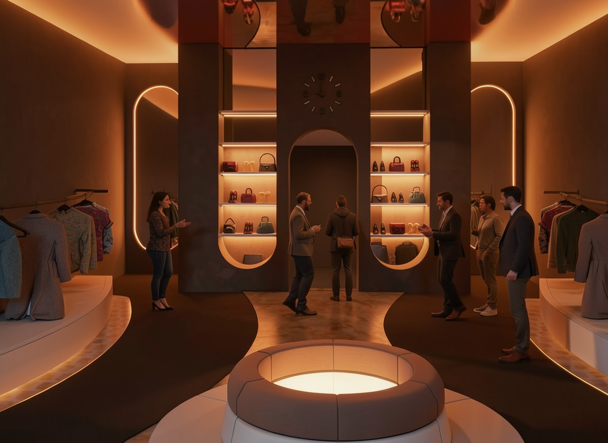 photorealistic luxury boutique render using the reference image exactly keep all materials layout and finishes unchanged the back wall is solid all arches and mirrors are symmetrical and the ceiling is mirrored use warm orange ambient lighting that follows all curves add 2 4 well dressed shoppers naturally interacting in the space subtle and not blocking the architecture maintain a moody high end retail atmosphere