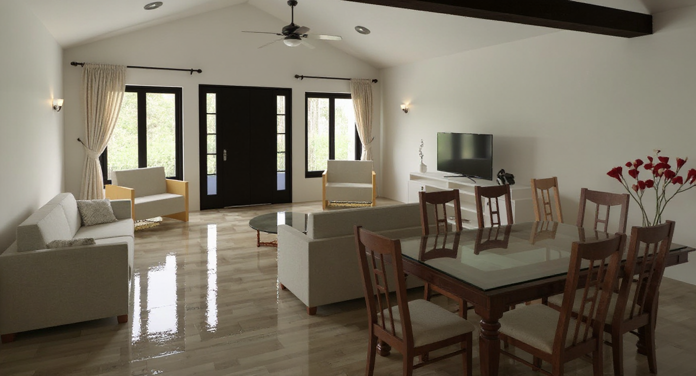 exterior shot its a living room with vaulted ceiling add lighting fixtures ceiling fan and curtains to the windows the dining table is dark wood with a crystal top the living room has the same wood floors but not glossy