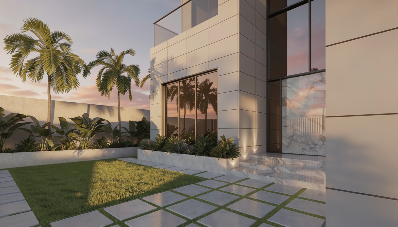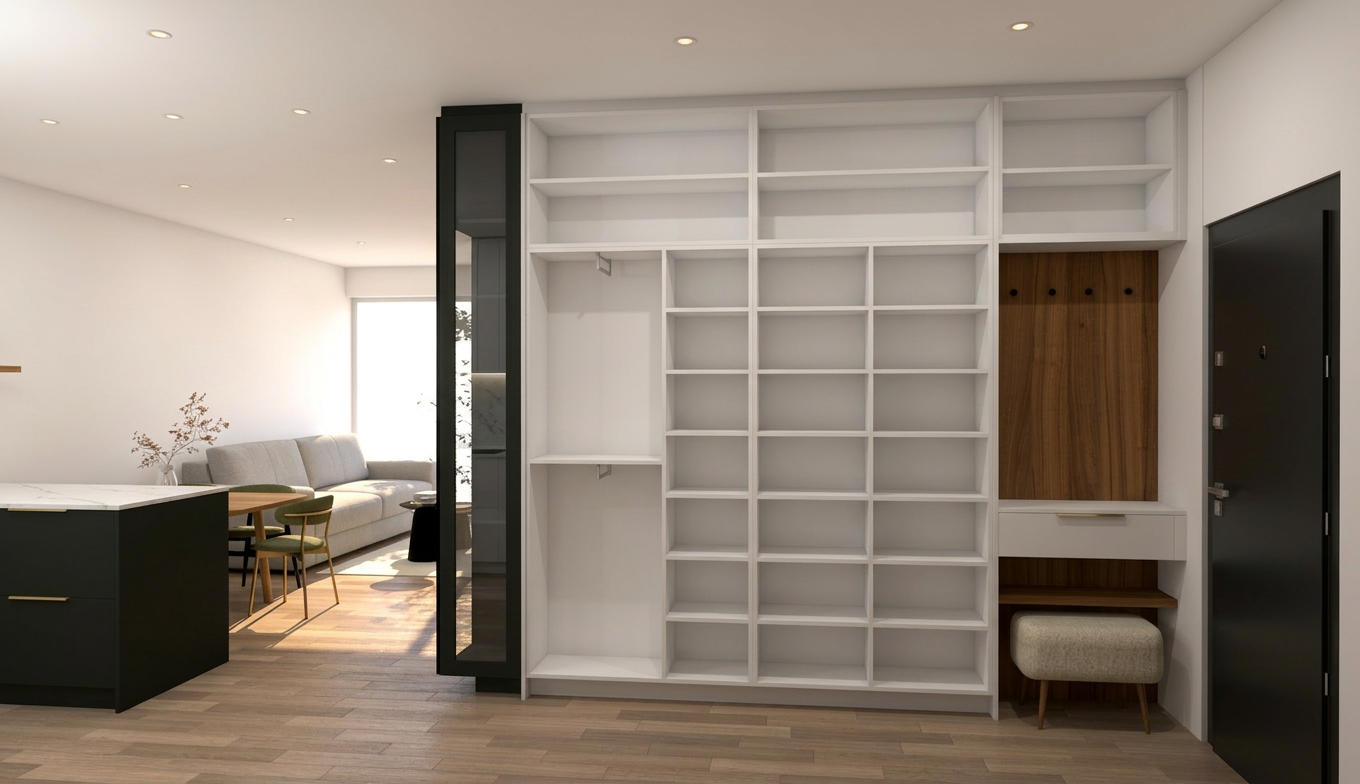 a terra abbiamo un parquet in rovere chiaro continuo dopo l arcata abbiamo un pavimento in linoleum beige chiaro il banco della reception in vetro cannettato con fondo specchiato e non ha le strip led da nessuna parte lo zoccolo della reception nero e anche il bordino sottile sotto la piana la piana del banco in graniglia bianca sopra la piana ci sono due lampade a sospensione accese dietro alla banco la parete rivestita con lo stesso parquet in rovere chiaro continuo posato a pavimento con il logo illuminato sui bordi non ci sono da nessuna parte strip led come illuminazione metti qualche deplian e delle penne sopra al banco reception uno o due zaini per fare una zona conviviale e accendi la tv sulla sinistra il piano da gioco del biliardo grigio antracite