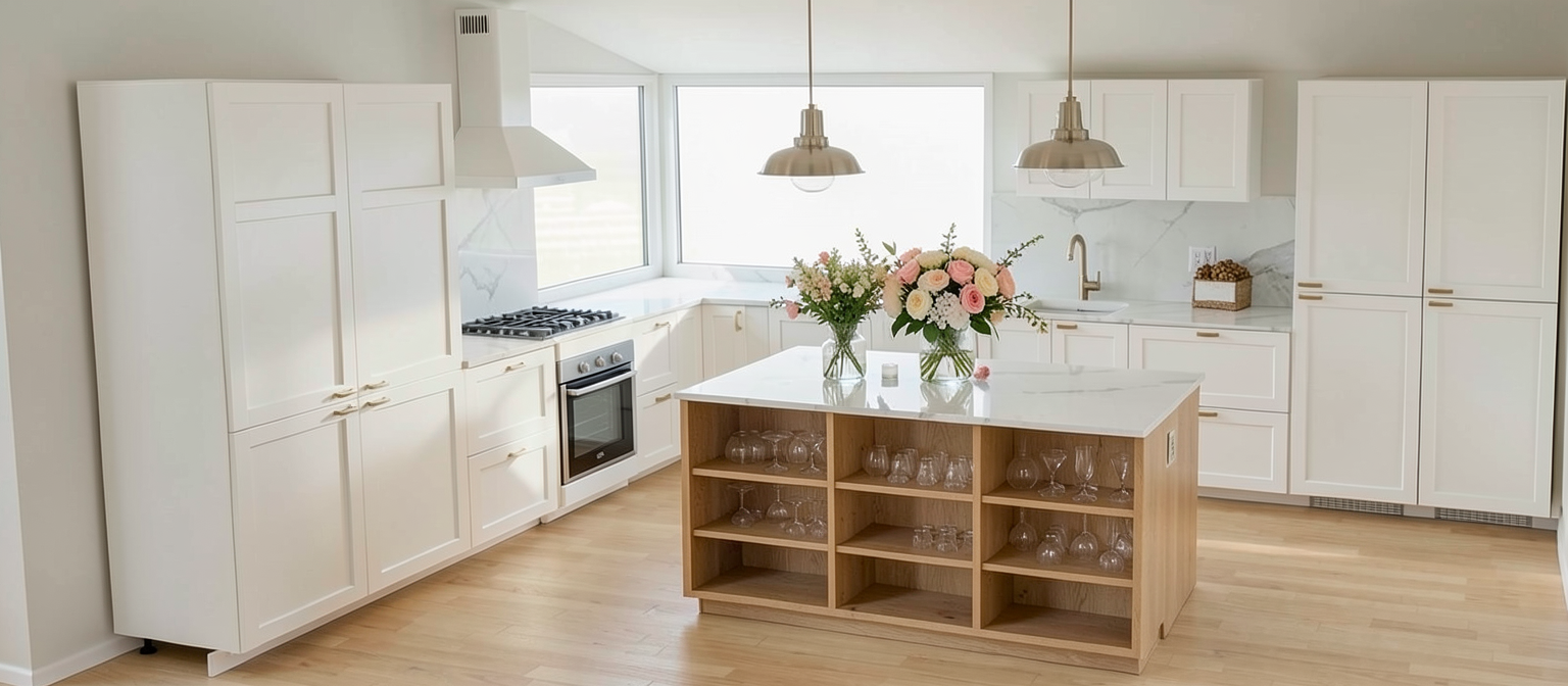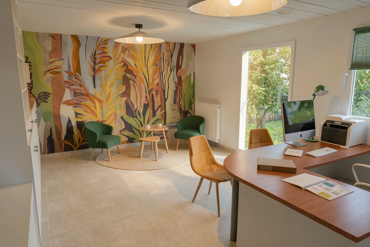 create a cozy modern living room with a warm and inviting atmosphere include a beige sectional sofa adorned with soft rust colored and patterned pillows add a light wooden floor and a shaggy cream colored area rug incorporate a wooden coffee table in the center and a white wall mounted tv unit feature a corner fireplace with light brick housing a lively fire add white curtains framing tall windows that brighten the room with natural light integrate a white shelf with decorative items above the fireplace incorporate a wooden slatted room divider with green potted plants on top include a white storage bench with gray cushions near the divider accented with more pillows and a soft throw add a touch of elegant simplicity with minimalistic line art on the walls the overall color scheme should be neutral with pops of warm earthy tones