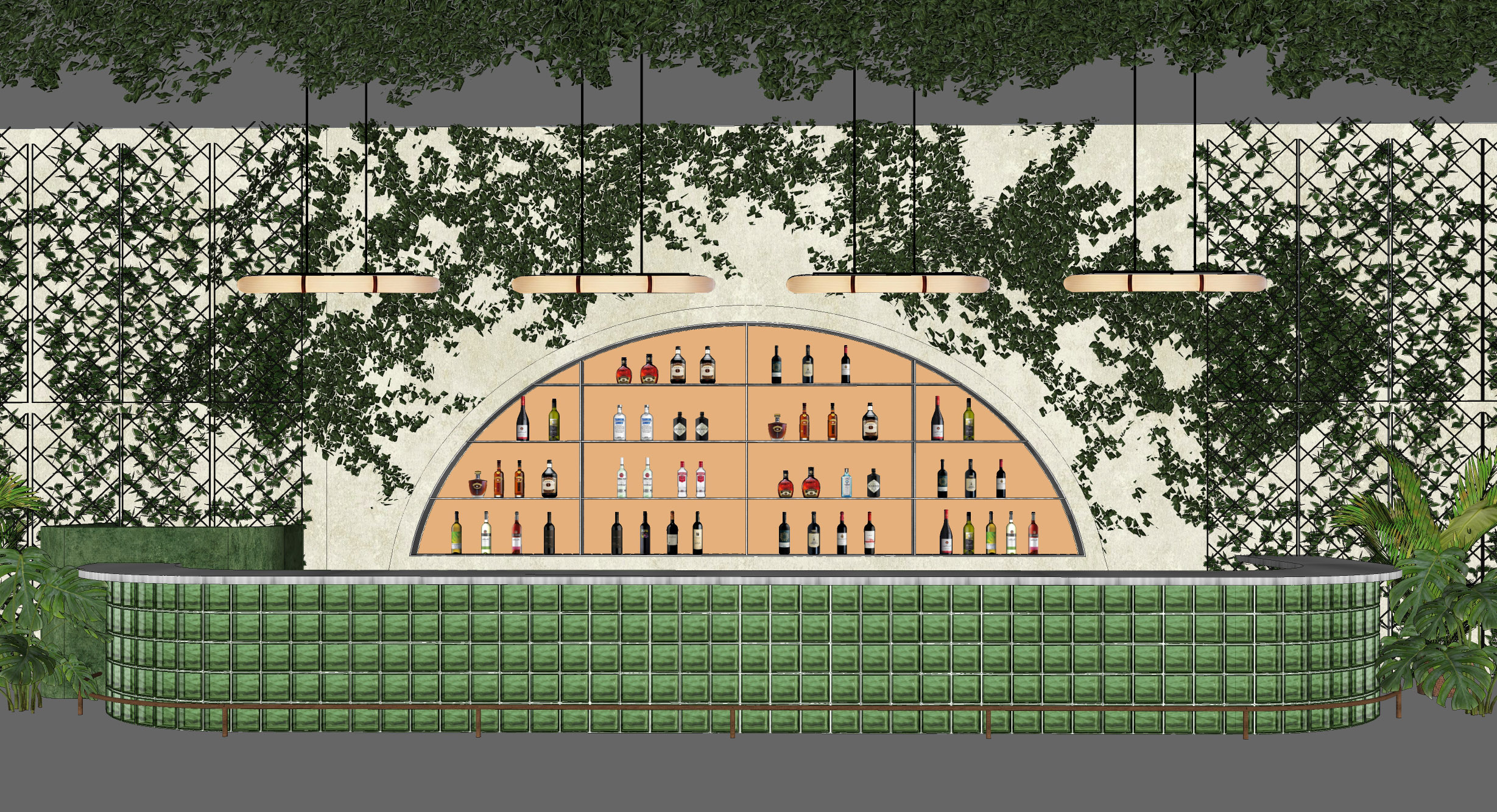jard n para so bar tropical contemporary design frontal elevation symmetrical composition night scene green translucent glass block bar counter internally backlit with warm led glow top and bottom light strips soft diffused illumination brushed stainless steel countertop with subtle reflections above the bar four suspended linear pendant luminaires evenly spaced minimalist design slim elongated form matte finish emitting warm 2700k light black suspension cables from ceiling soft downward glow creating intimate pools of light over the bar counter semi circular recessed back bar niche stainless steel floating shelves with liquor bottles glossy bright orange acrylic back panel warm indirect led backlighting vibrant luminous backdrop metal trellis wall covered with climbing vines and greenery vertical garden effect tropical plants on both sides monstera deliciosa palms lush foliage ceiling with dense hanging vines and integrated warm ambient lighting rustic natural stone garden flooring matte texture warm cinematic lighting high realism architectural visualization ultra detailed materials soft shadows intimate atmosphere contrast between glowing bar and warm pendants reflective stainless steel volumetric warm light professional architectural photography 35mm lens shallow depth of field hdr 8k ar 16 9 style raw