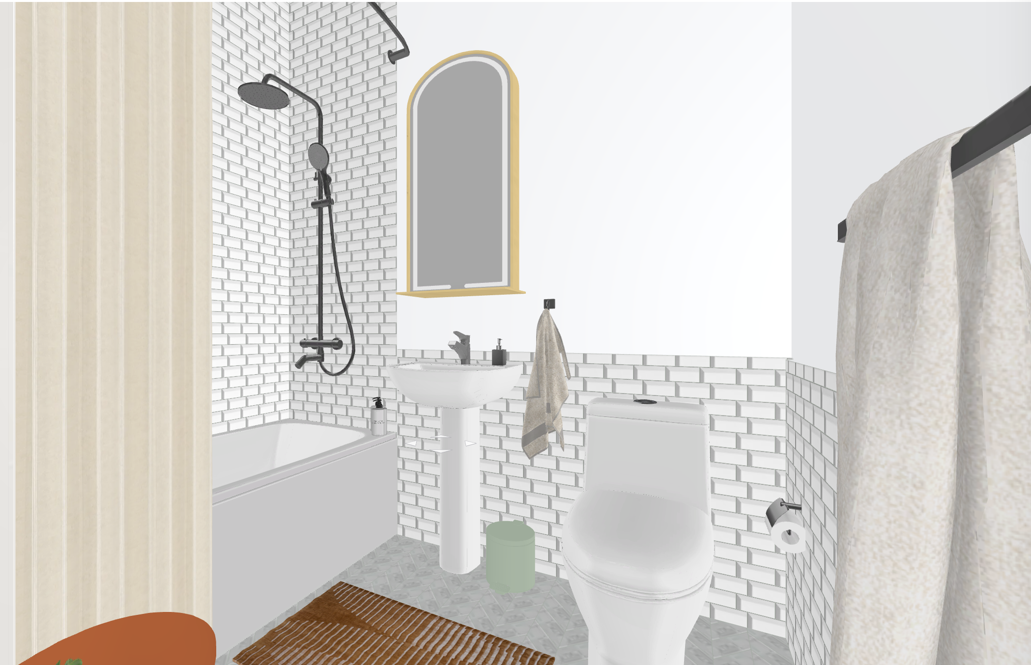 render a modern bathroom with a minimalist style there is no windows the walls are covered in small glossy white subway tiles reflecting light install a sleek metal shower head and faucet for a touch of elegance place a white bathtub next to a classic round pedestal sink the shower curtains are in striped beige linen material above the sink hang an arched medicine mirror framed in brass incorporate a beige towel hanging beside a contemporary white toilet the floor is covered in herringbone patterned grey tiles add a small moss green waste bin with lock and an orange bath mat for texture ensure soft natural lighting creates a serene and cozy atmosphere