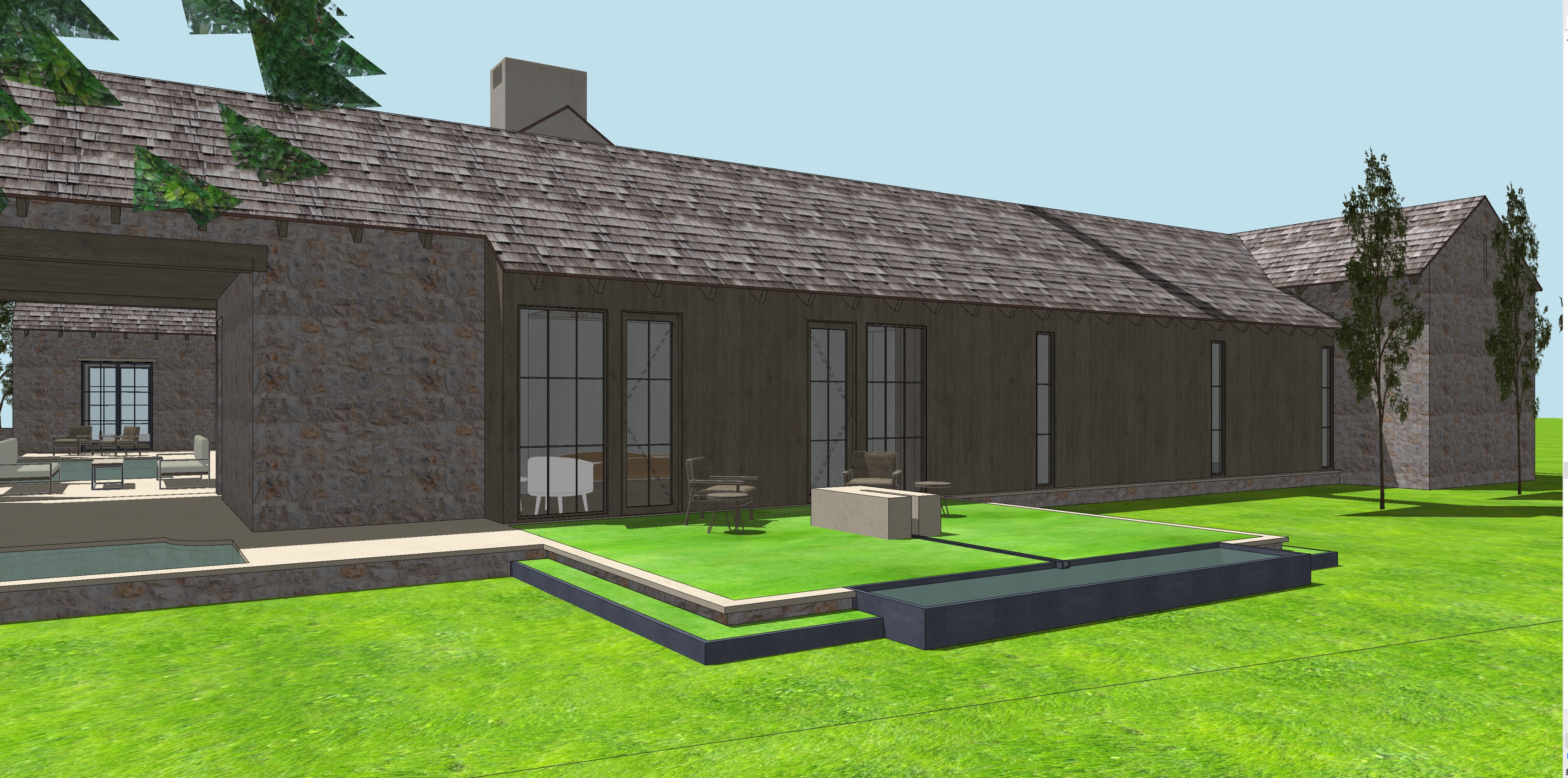 cedar shake roof rough cut limestone hewn mushroom siding blackened steel off white plaster