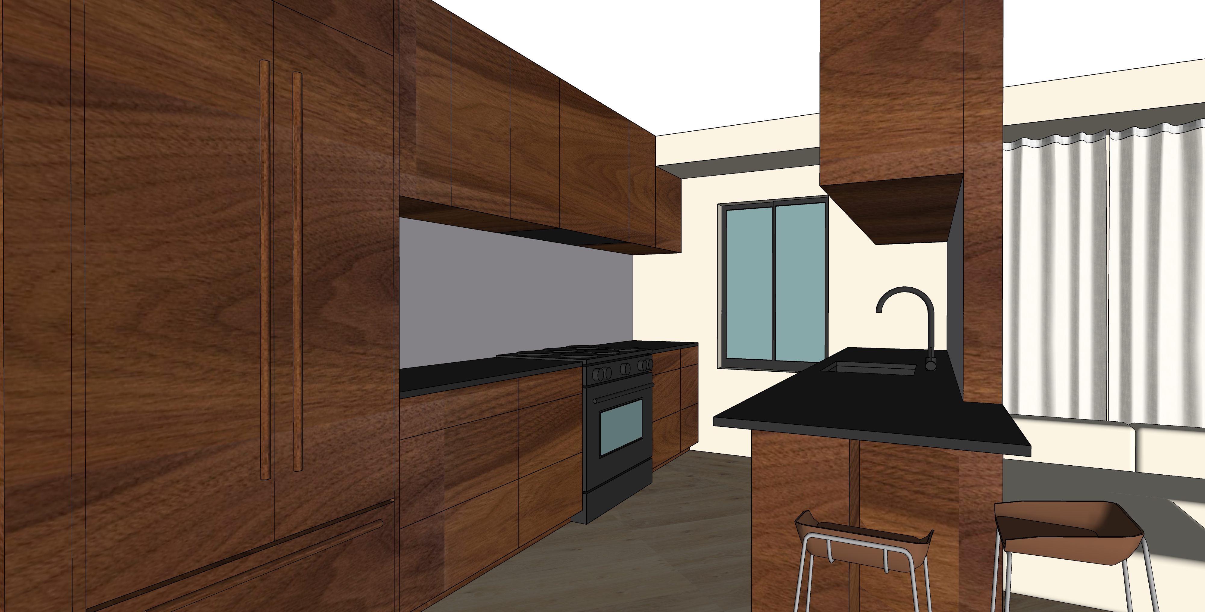 interior shot walnut cabinets white oak floors under cabinet lighting mirror backsplash modern architecture