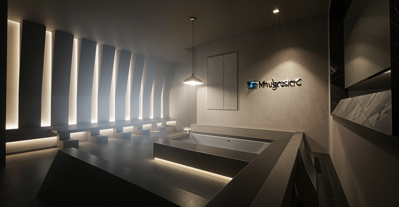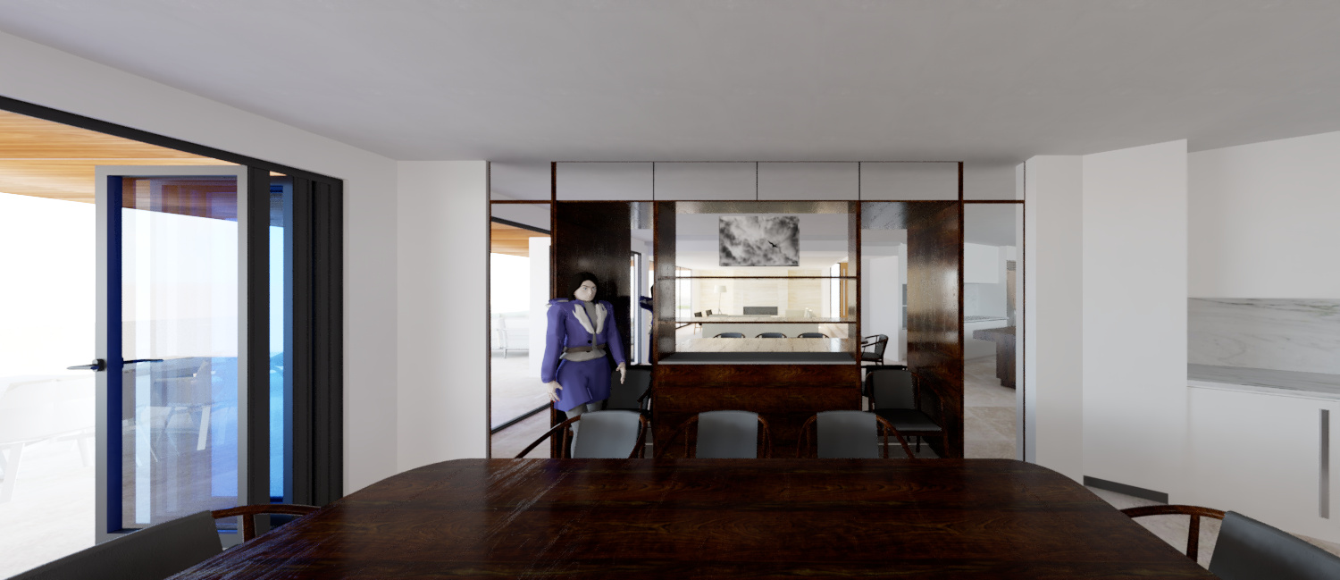 create a modern dining room and adjacent kitchen featuring a spacious walnut table surrounded by elegant walnut chairs with black leather cushions the atmosphere is warm and inviting enhanced by rich walnut and glass mirror cabinetry and there is an ocean view reflected in the glass mirror incorporate white walls and a light marble backsplash in the kitchen the kitchen cabinets are a white satin finish and color add a large window with black frames for natural light to flood in a bright airy feel the floor is light stone tile complementing the neutral palette