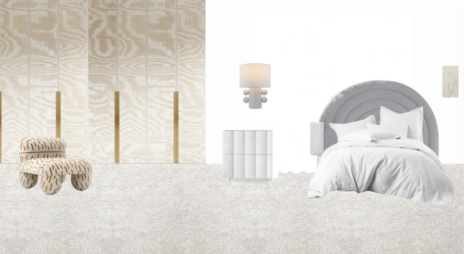 soft sculptural modern bedroom with warm neutral palette maintain layout based on moodboard composition bed centered with curved upholstered headboard in light grey fabric bedding in soft white layered textiles with natural folds flooring is plush textured carpet in warm cream custom wardrobe cabinetry in light natural wood with subtle grain and long vertical brass handles additional accent pieces include sculptural boucle lounge chair with warm patterned upholstery and soft rounded form lighting is soft and diffused with modern wall sconces in warm neutral tones materials are highly detailed with realistic fabric texture subtle imperfections and natural variation soft daylight combined with warm ambient lighting calm minimal luxury atmosphere photorealistic interior render no stylization no illustration