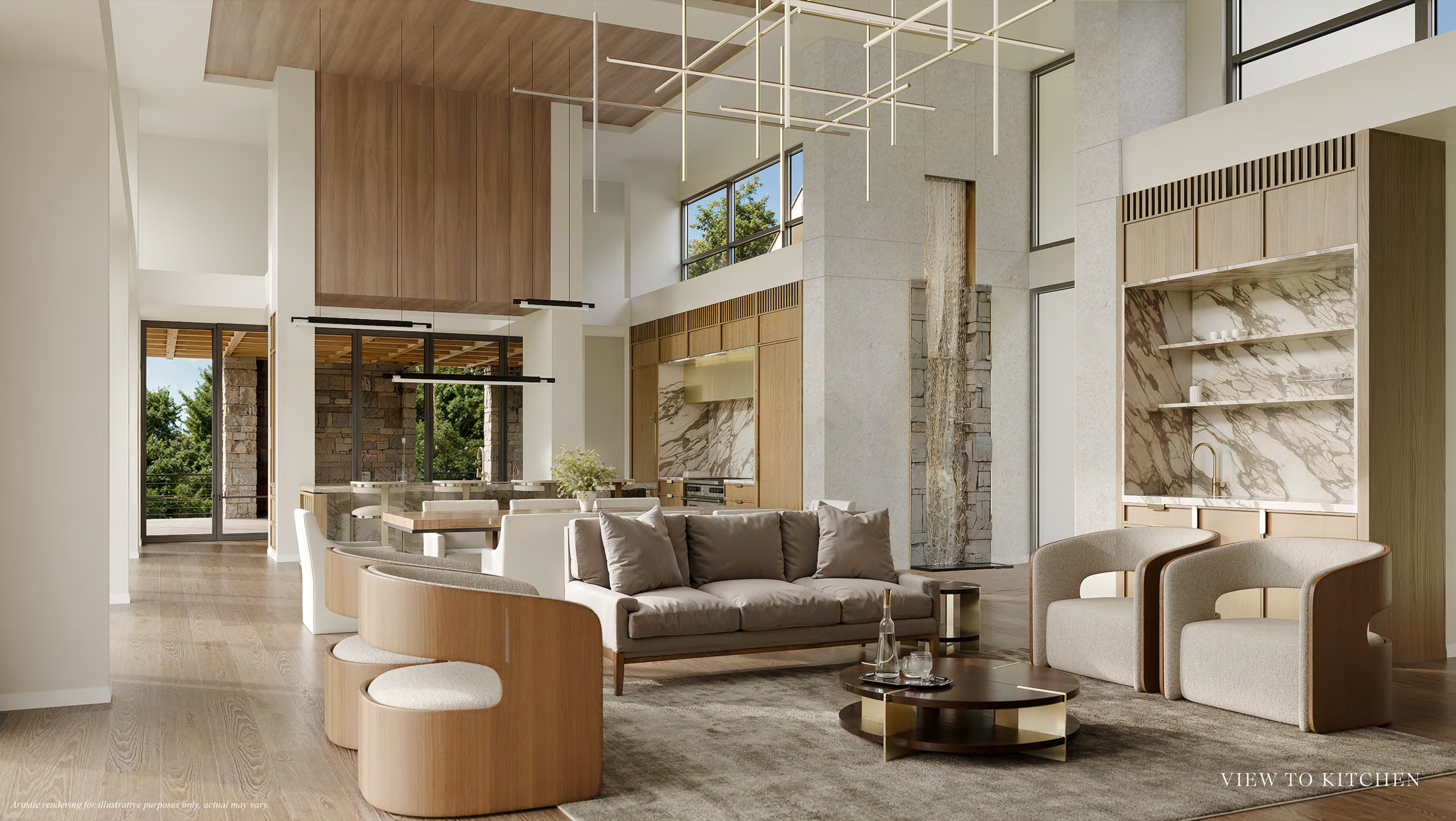 add linear fireplace in distance that is outside of the glass doors on a porch change only the wood gridded portion of the ceiling on the porch to be drywall add more realism to water element feature