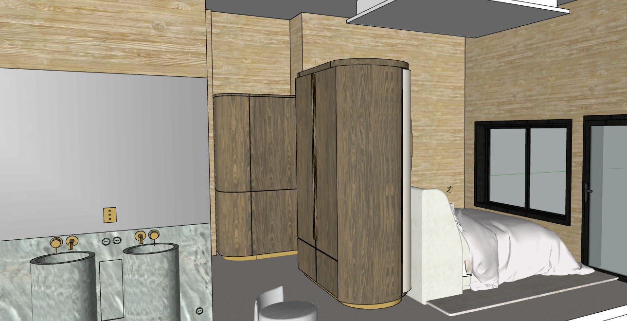 realistic rendering of this sketchup picture the wall are made by very light wood because it s a luxury chalet master bedroom the walking closet is in noyer and the bathroom is made by a very light green marble