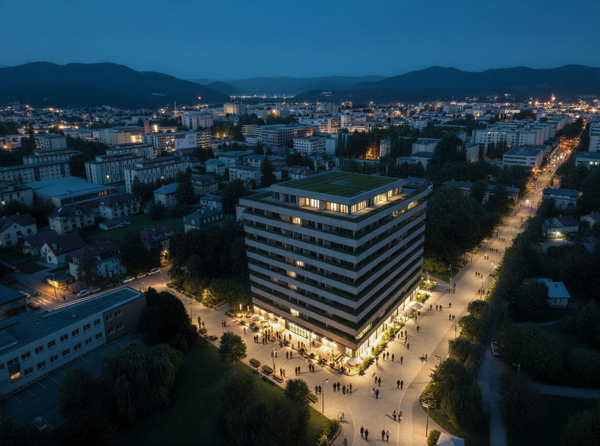 a futuristic skyscraper with an elegant twist design its structure is made of reflective glass panels that shimmer with shades of light blue and silver the building is set against a clear blue sky evoking a modern sophisticated atmosphere surrounding the base are lush green trees the sunlight casts soft shadows enhancing the building s dynamic contours and adding depth to the scene