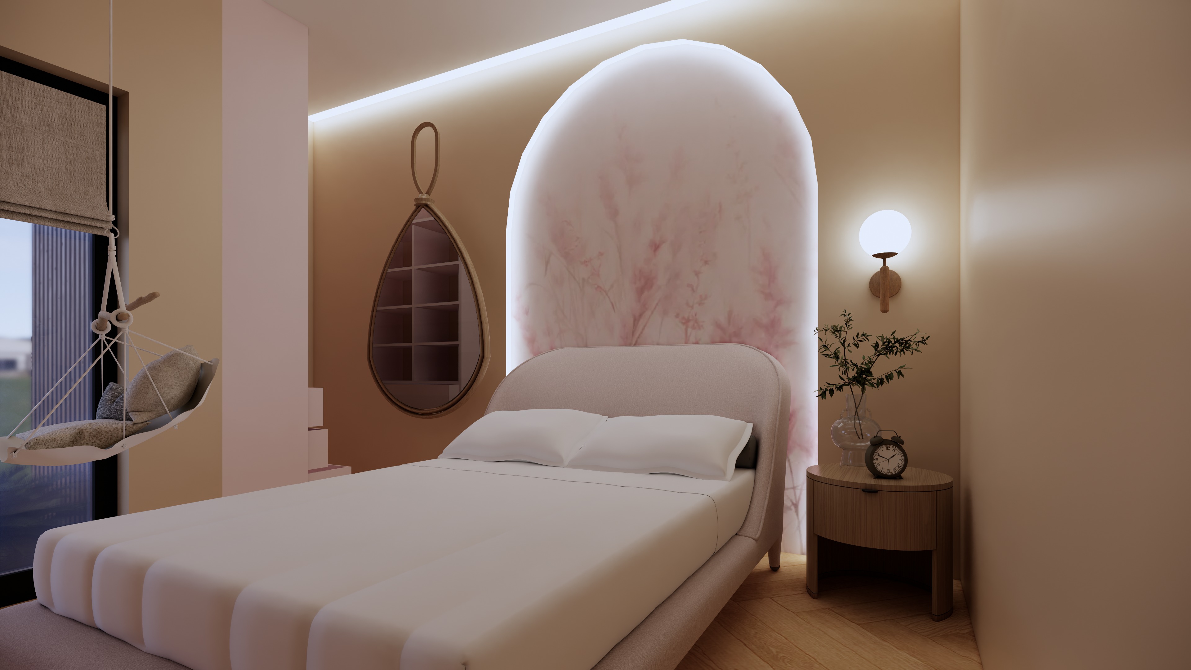 keep the exact same colors and shape with a soft pale pink touch on the bed and left waredrobe add realism