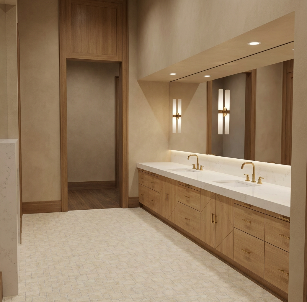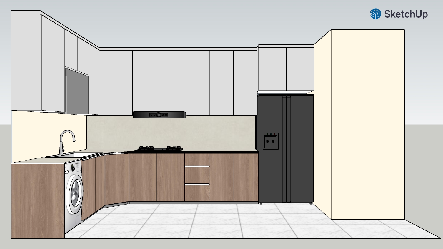 photo realistic interior render based on uploaded sketchup snapshot keep all dimensions camera angle and proportions exactly as modeled apply scandinavian inspired minimalist design with light grey 800mm x 800mm floor and wall tiles for a clean modern look remove all cabinet handles to create a seamless handle free aesthetic ensure the render highlights natural light soft textures and functional simplicity convincingly showing the client how the final product of the house will look while capturing their attention with elegance and precision