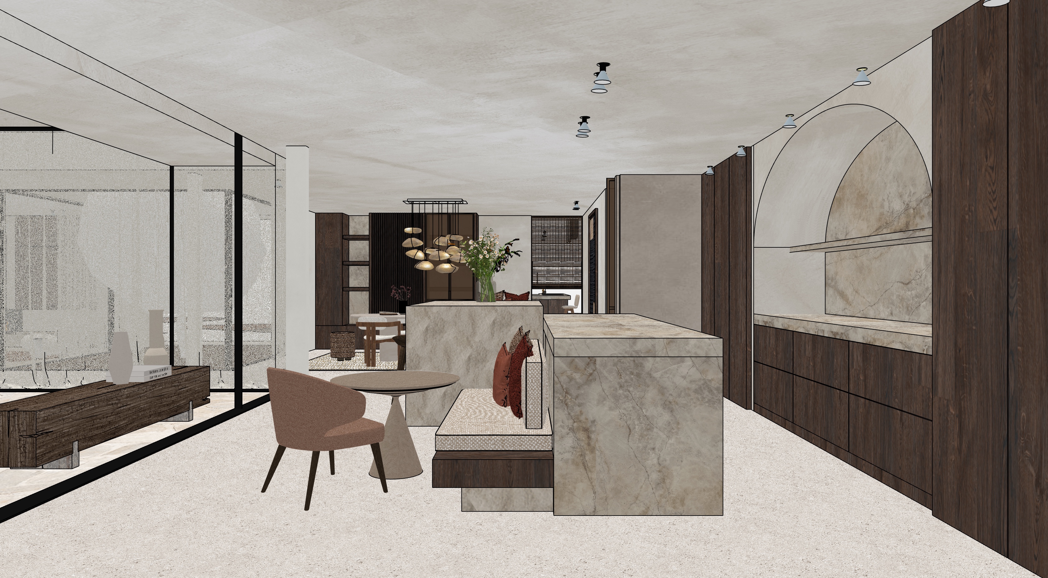 ultra photorealistic architectural interior render preserve exact camera angle composition scale and layout improve lighting material realism and depth only high end contemporary interior soft natural daylight mixed with warm artificial lighting accurate materials refined textures no exaggeration editorial quality calm and elegant atmosphere