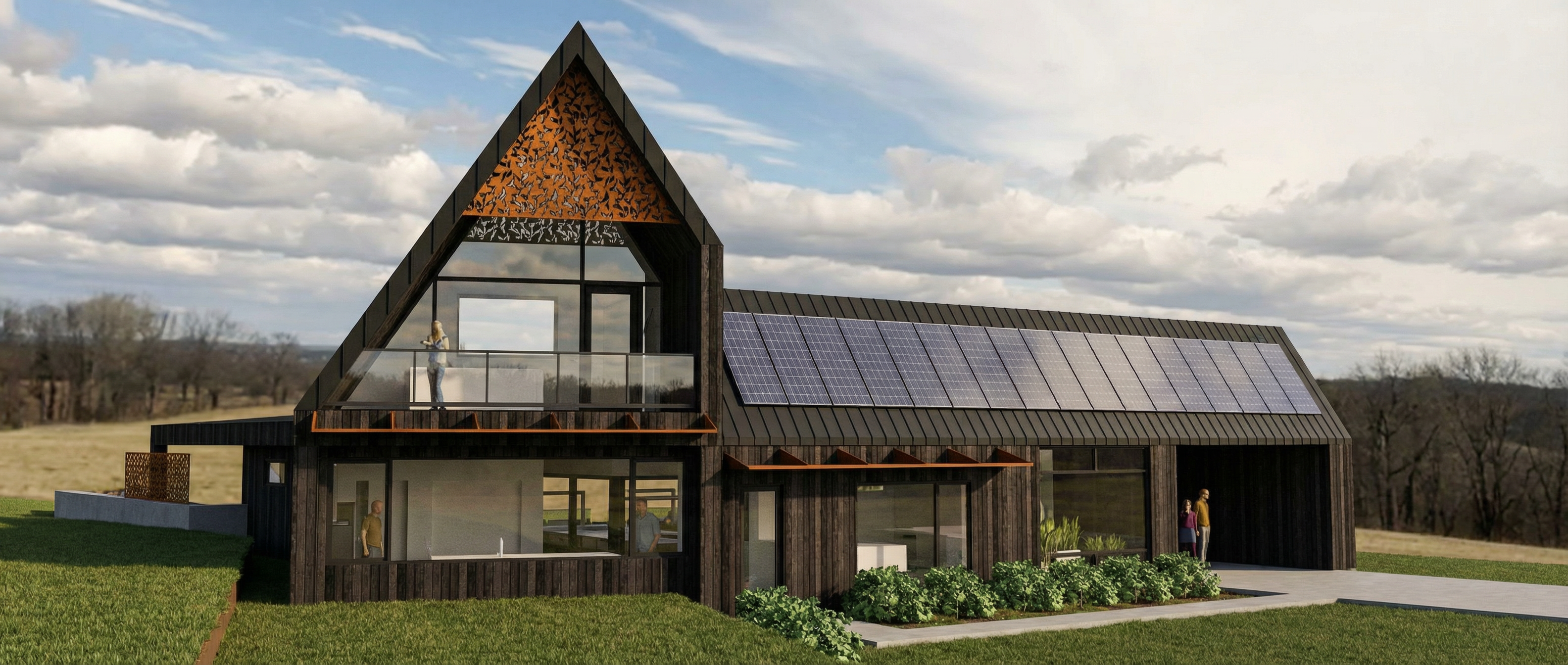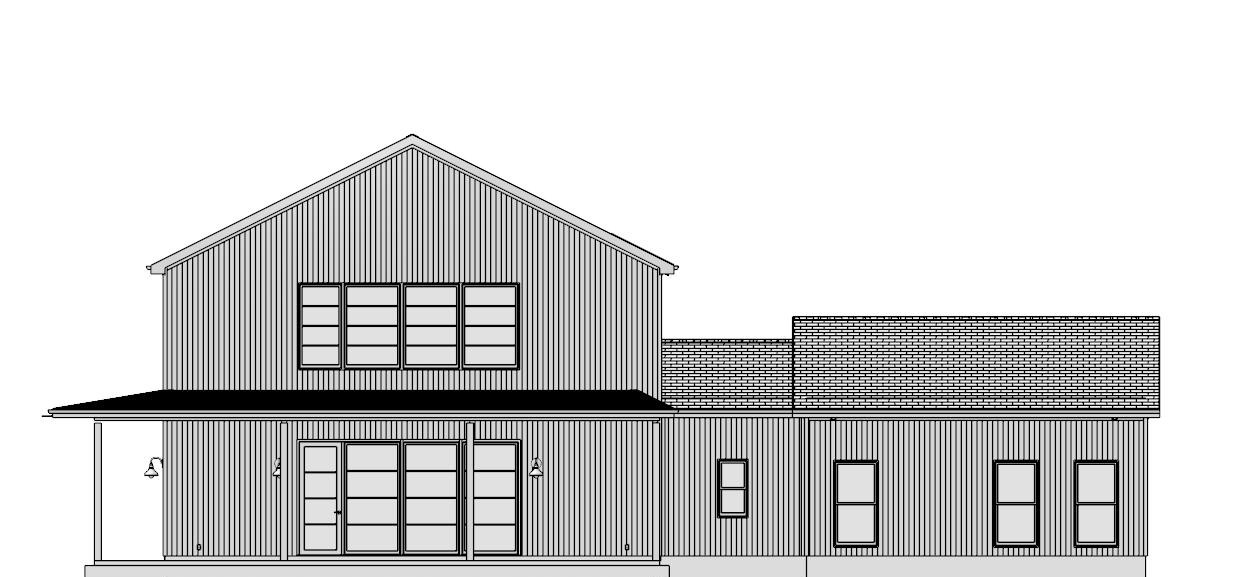 render the architectural elevation in a soft minimalist watercolor sketch style use warm desaturated beige and cream tones for the building surfaces paired with thin clean black linework for window frames incorporate subtle pencil like edge strokes and delicate shading surround the building with loose airy botanical elements lightly sketched trees and shrubs in muted greens and browns with a semi transparent hand painted quality maintain a bright white background with low contrast and a calm natural aesthetic overall look should be elegant modern and artistic blending architectural precision with soft illustration textures match the lighting tones textures and mood of the reference image the exterior material of the house is black vertical metal siding with a black metal roof