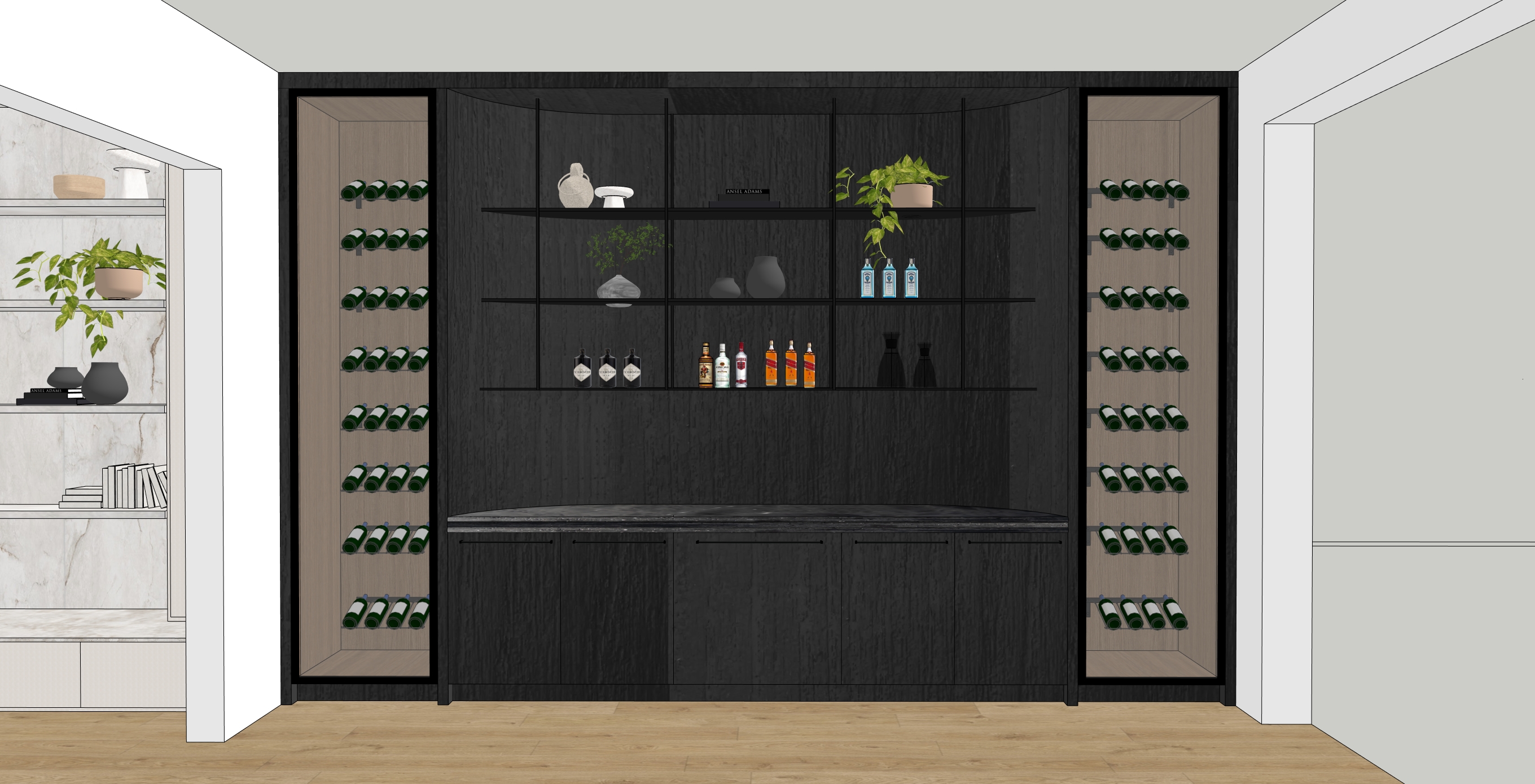 add led to the bottom of the 3 floating metal shelves and also to the wine storage keep the colours the same as the image the countertops are honed finish and have a triple bullnose edge make the render in day time