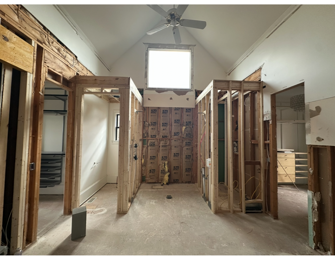 interior shot the room has excess vertical volume that needs to be visually softened add sloped soffits over the door header areas these soffits must start at the top of the wall heads slope upward to match the existing cathedral ceiling pitch fully eliminate all exposed wall head dead end planes no crown molding use clean square terminations with a subtle shadow line soffits should feel intentional and architectural not boxed in or decorative