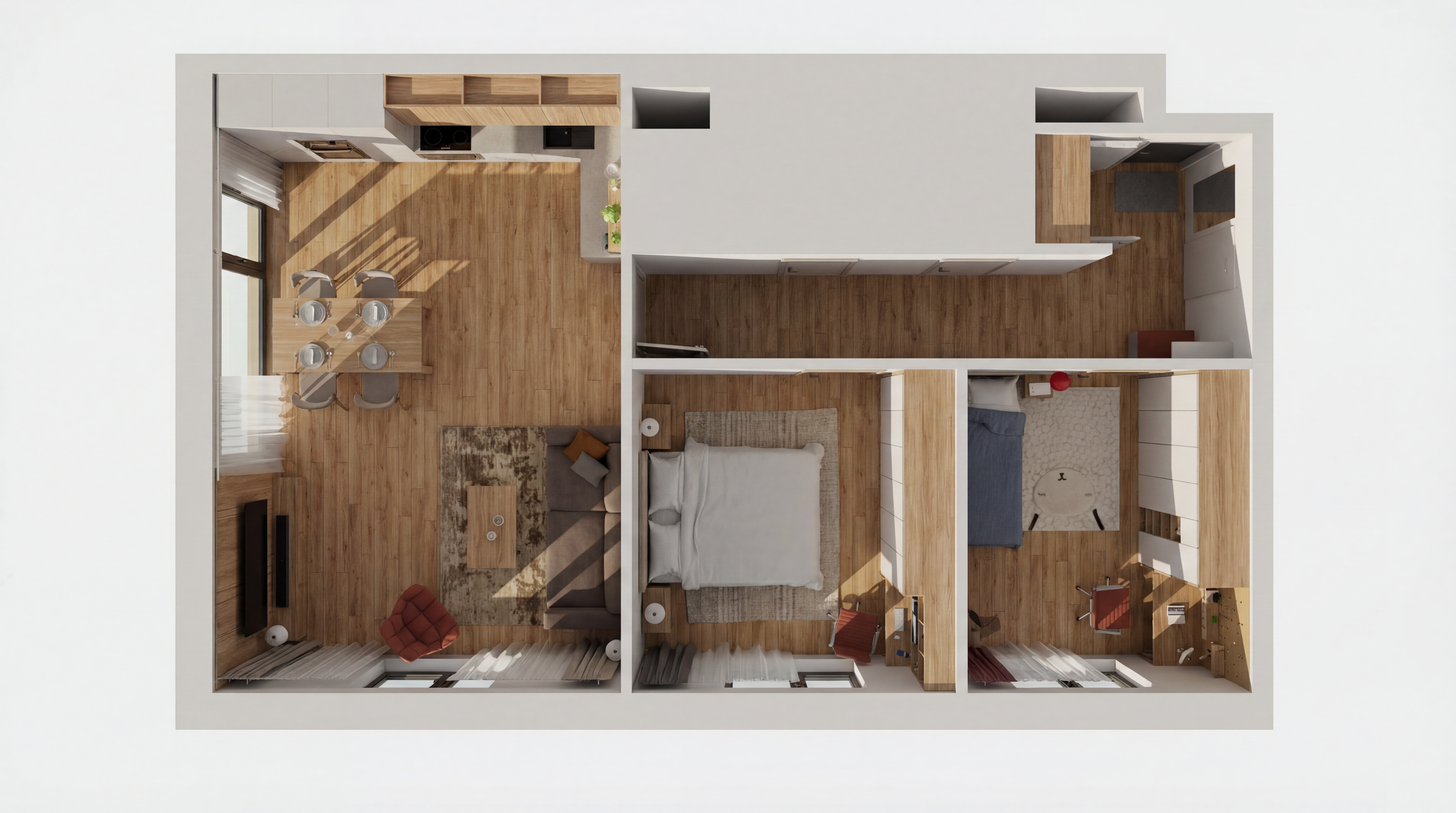 clean this up change this into a modern luxury living room suspended tv console with led light below on the right wall wall mounted tv on the right wall sofa on the left wall keep the walls ceiling and windows same