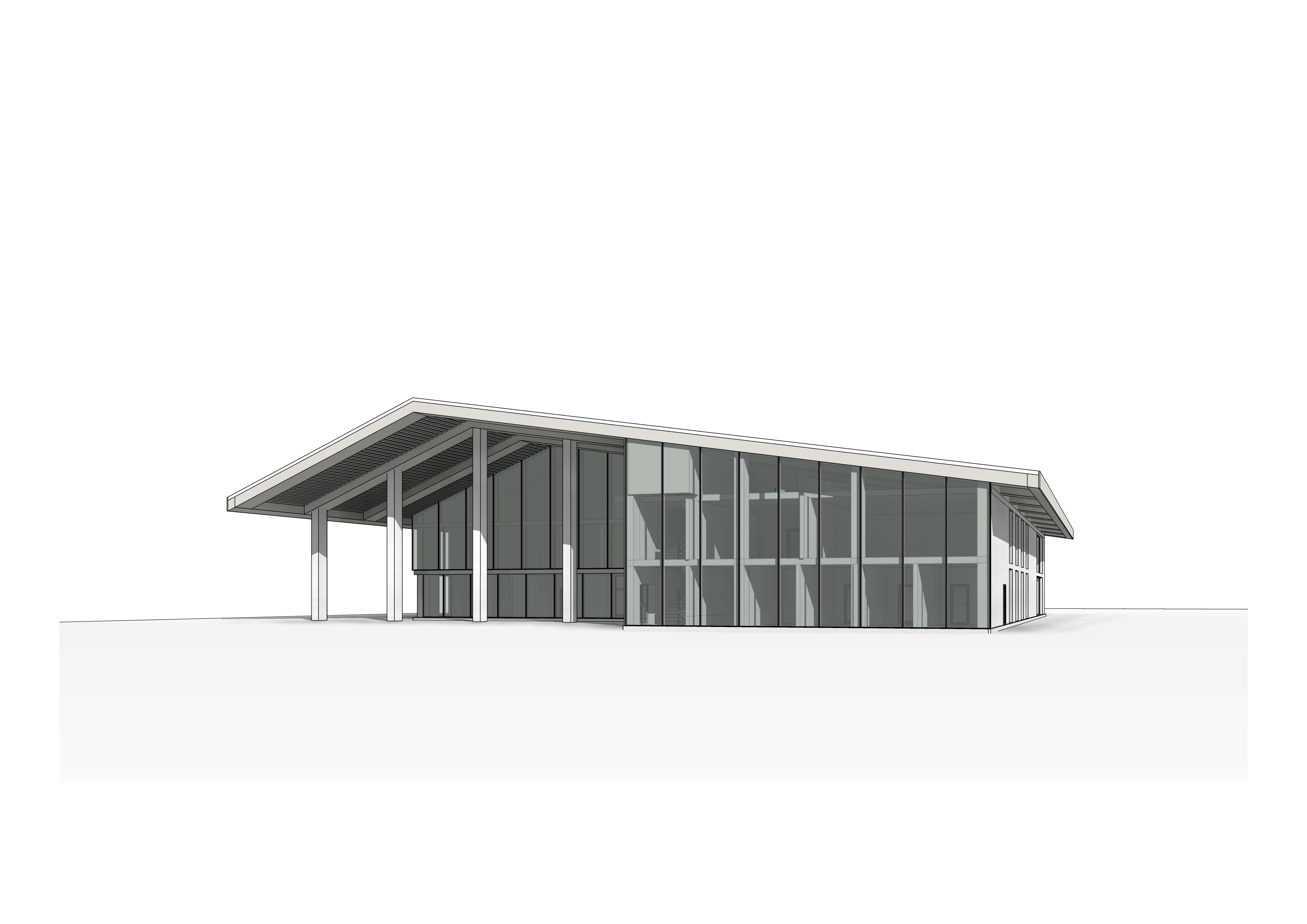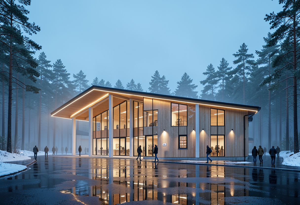 modern nordic 3 storeys library building keep the exact geometry proportions roof shape and window positions unchanged do not add or remove any windows do not modify structural layout improve only materials facade detailing transparency and atmosphere architecture style contemporary scandinavian elegant minimal warm but expressive facade refinement natural vertical timber cladding light oak thermowood tone dark matte standing seam metal roof anthracite slender light concrete or white columns refined dark metal window frames deeper window reveals for shadow depth clean minimal concrete plinth enhancements add a thin continuous concealed led light strip along the roof edge warm 3000k creating a floating roof effect emphasize strong horizontal roof line with subtle glow under the overhang make the first floor maximum transparent full height clear glass minimal framing visually open interior reduce visual weight of ground floor walls increase transparency feeling warm wooden ceiling visible through the glass soft interior lighting creating contrast with cold exterior environment pine forest surroundings wet reflective pavement blue hour winter atmosphere soft fog in background people walking naturally warm interior glow contrasting cool forest tones cinematic architectural competition render high realism volumetric light soft shadows
