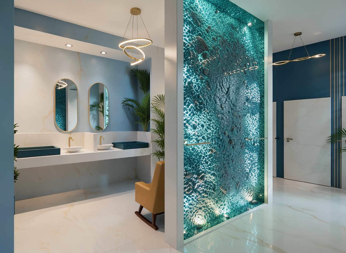 we created this bathroom for florida international university we are trying to make it tropical for miami and using the fiu colors of blue and gold render this realistic remove the curtain and put a indoor water fountain on the wall feature remove window remove the door in the back and put bathroom stall