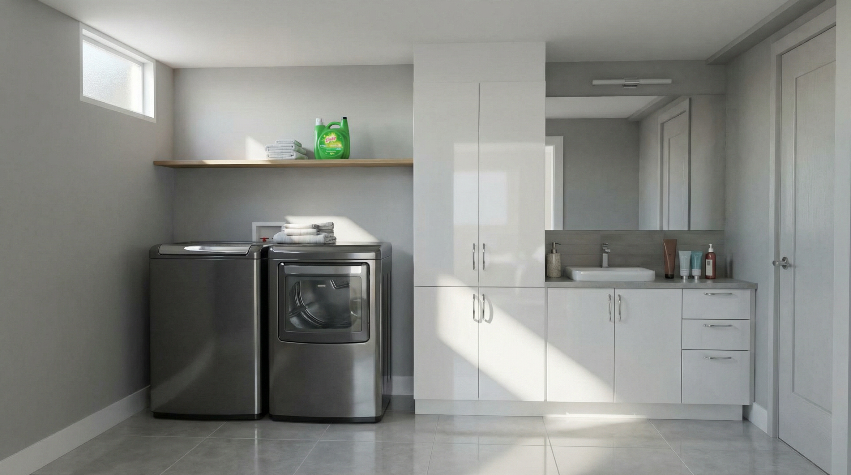 keep geometry create a beautifully rendered image of a modern kitchen use a neutral palette with soft white for the walls and cabinetr the countertop should be a light stone texture and the flooring should be a subtle gray tile add a small window casting natural light creating a tranquil and inviting atmosphere include subtle green accents from cleaning products and soft muted tones for towels and toiletries the overall mood should be clean organized and calming