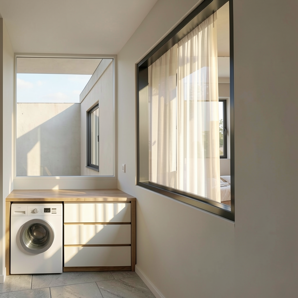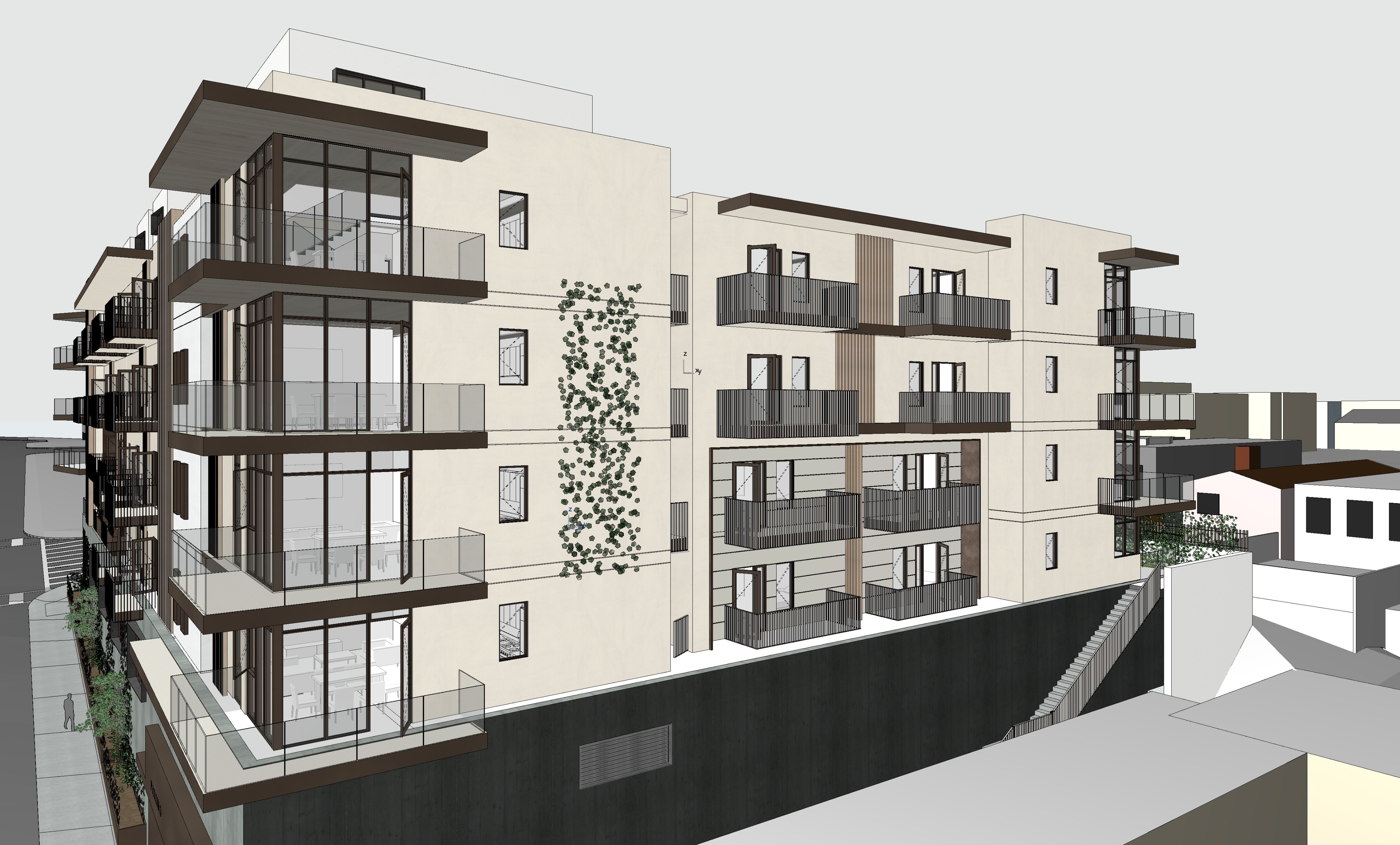 do not change the architecture at all smooth trowel stucco with light sand color light board form concrete building base vertical wood slats horizontal metal panel at recessed walls siding in light beige color slightly darker than stucco dark brown metal railings and horizontal fascia do not change the architecture at all sunset sky