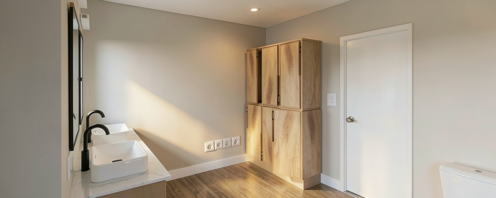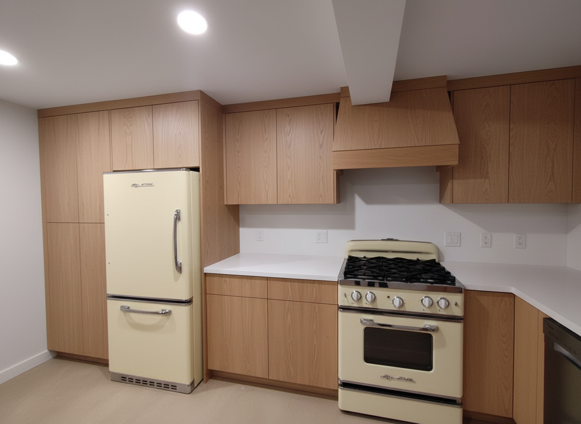 finish this kitchen with flat panel rift white oak cabinets please also add upper cabinets also include a stainless steel hood above the oven don t forget cabinets above the fridge also trim out the electrical on the backsplash also a panel to cover the fridge side trim out the electrical add undercabinet lights add shelves and cabinets on uppers