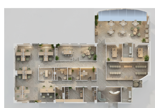 convert this floor plan into a realistic isometric 3d view of a full house show the space from an elevated angle with furniture walls and details visible render floor plan on top blue make it windows use the same furniture as shows on the plan do not change the orientation of the floorplan