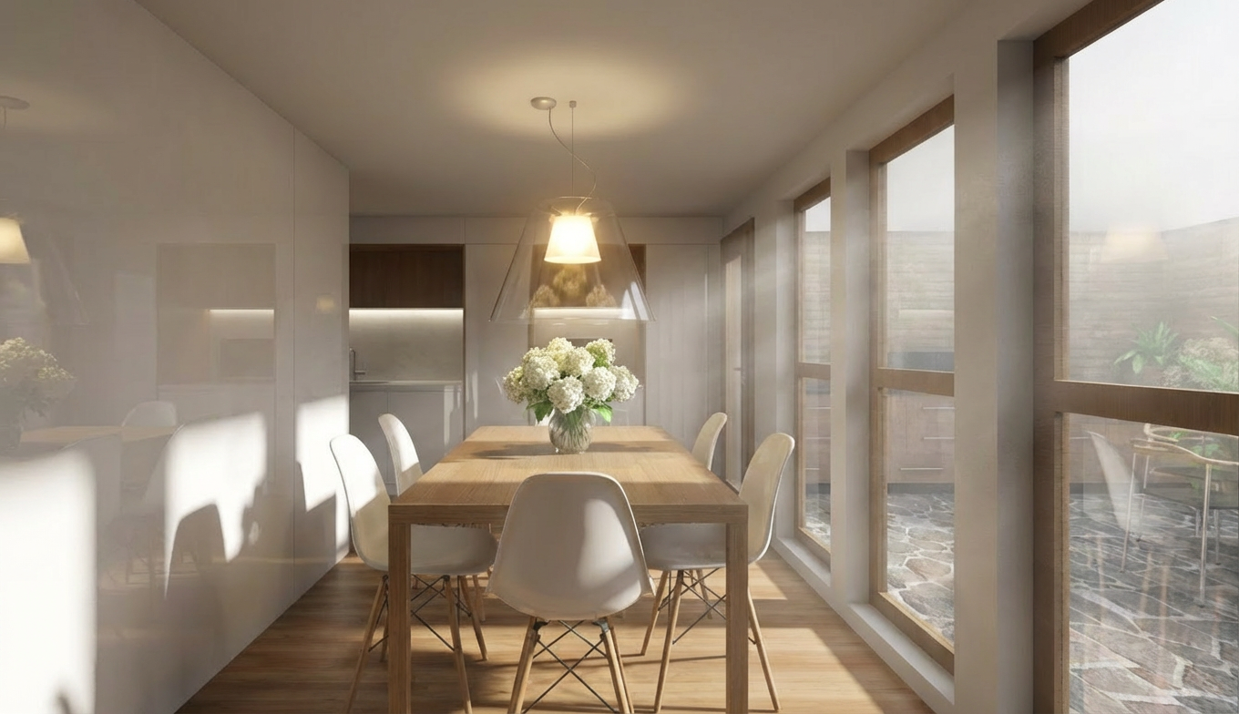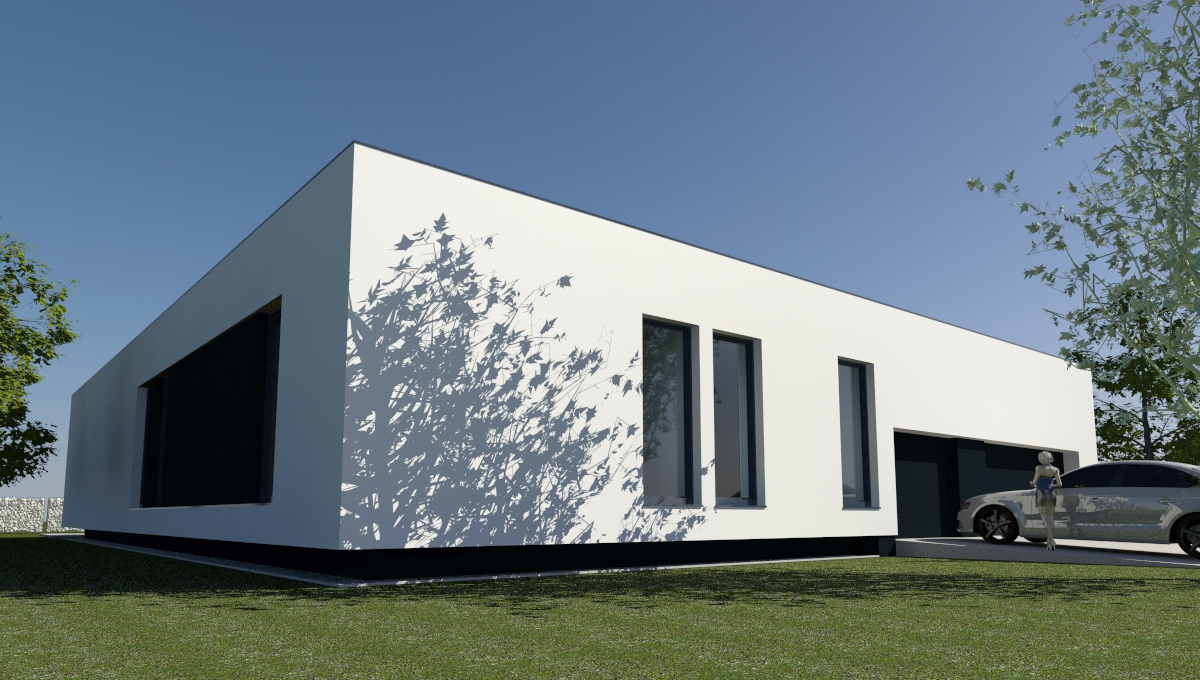 do not change the shape and volume of the building apply architectural concrete plaster in anthracite color on the facade add trees