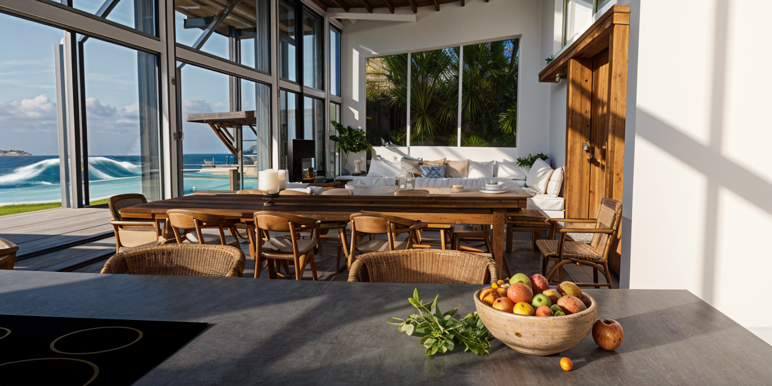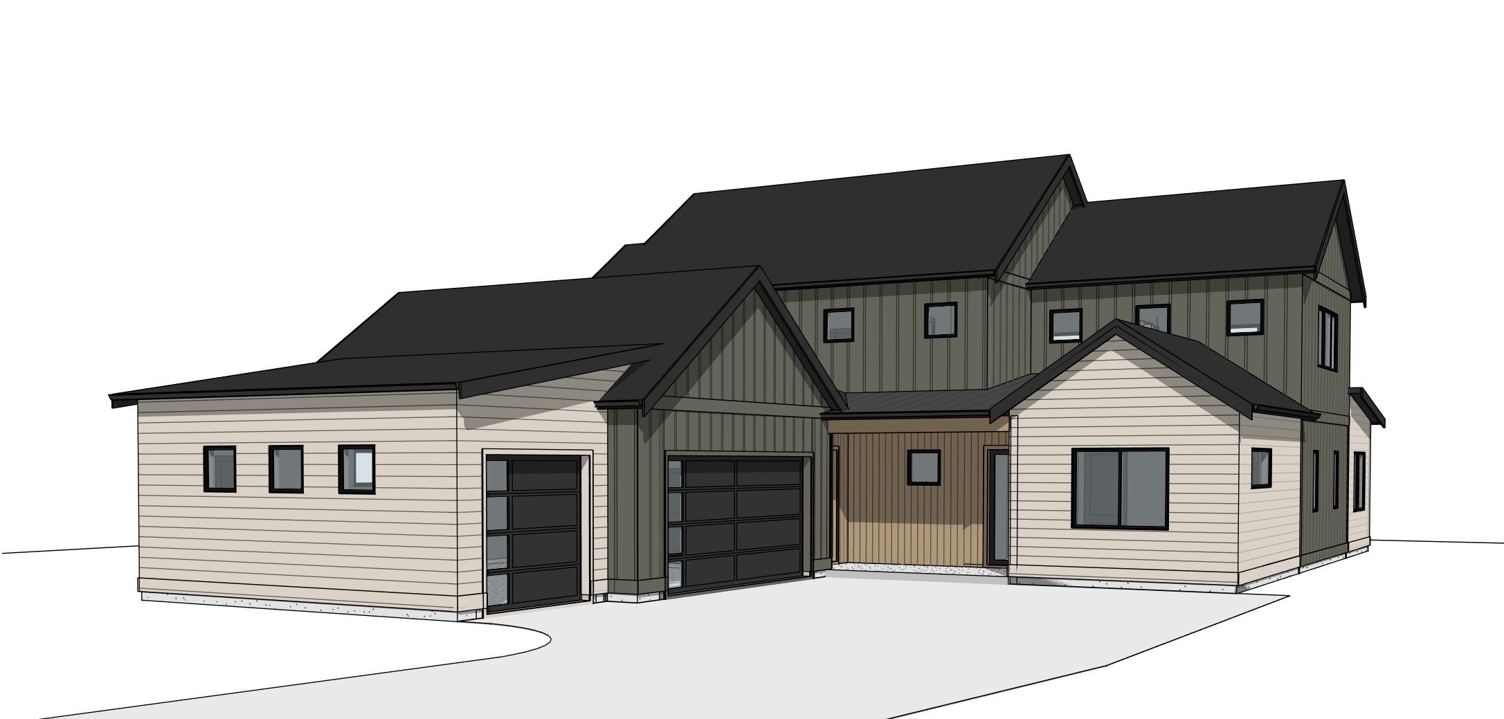 modern house exterior with a minimalist design medium beige siding with subtle wood texture dark greyish green board and batten siding on the main structure a small section at the entry with vertical wood accents charcoal gray asphalt shingle roof large windows with clear glass garage doors in sleek black smooth asphalt driveway serene afternoon light with a clear blue sky casting soft shadow landscaping including large shrubs and neatly trimmed grass for a polished finish mountains in the background