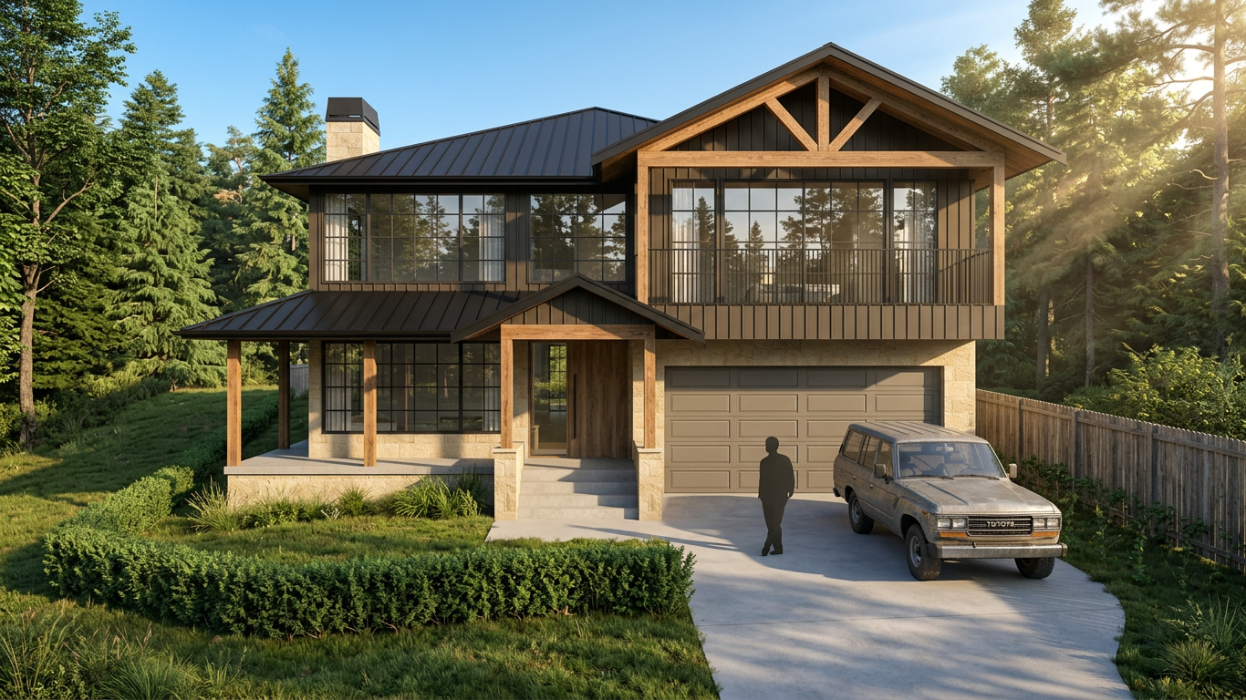 render a modern residential building with a sleek design featuring a brick facade with dark brown earthy tones the roof is clad in deep rich charcoal tiles the surrounding houses are a pristine white to highlight the contrast add lush greenery with vibrant green hedges and a few broad leaf trees casting gentle shadows the sky is a vivid blue with soft fluffy white clouds creating a serene and inviting atmosphere cars are modern and sleek painted in shades of gray and white with a clean minimalist aesthetic capture the scene with a warm natural light to emphasize harmony and sophistication