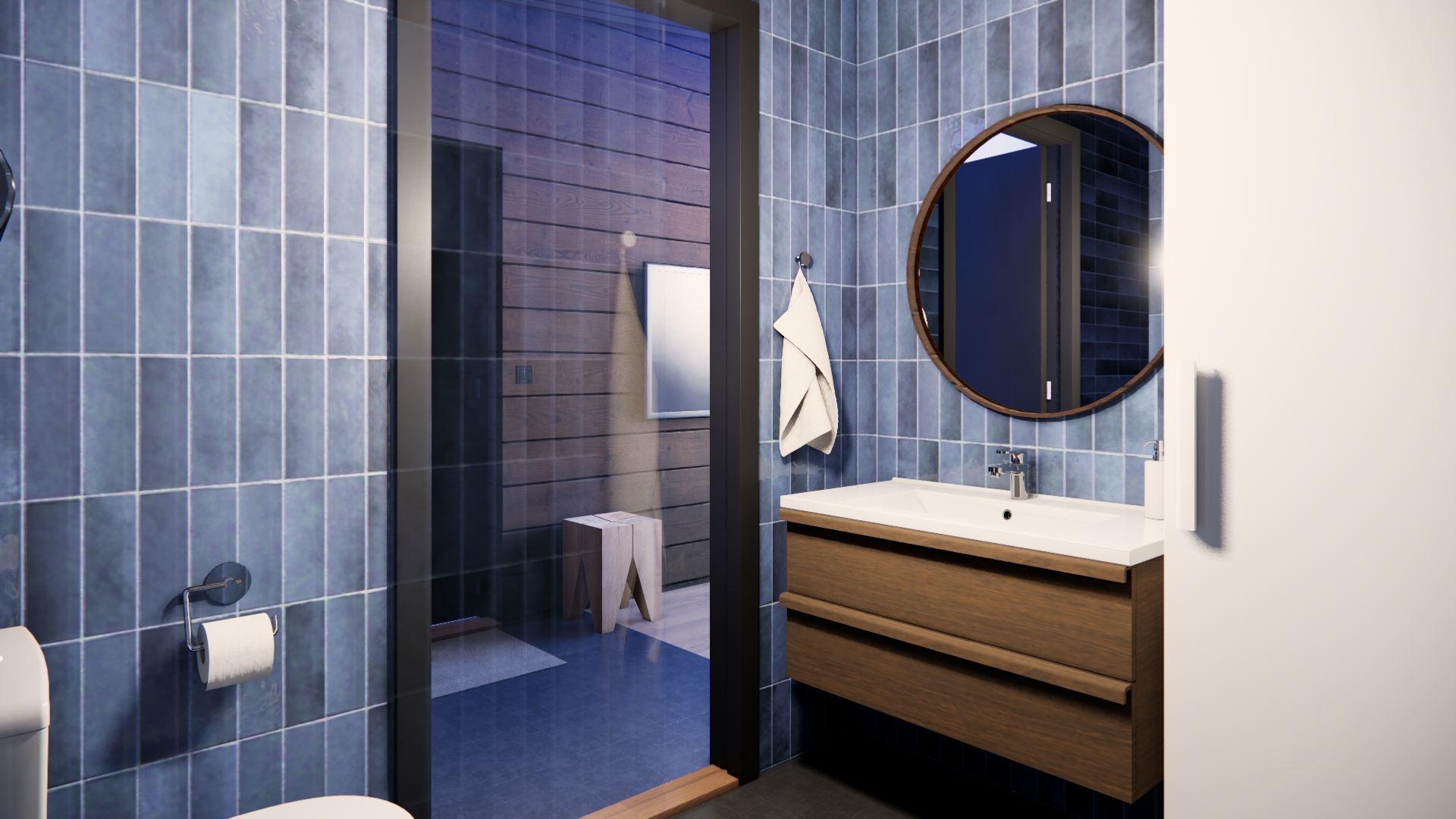 render a modern bathroom with a calm and sophisticated atmosphere the walls are covered in glossy deep blue tiles include a round mirror with a dark brown wooden frame and a white hand towel hanging beside it the sink is white with a sleek chrome faucet the floating vanity is made of rich dark wood add a glass door leading to another room with natural wood paneling visible through it use cool ambient lighting with soft shadows to enhance the serene and elegant ambiance no bloom haze there is a glass shower wall between the camera and the toilet seat on the left the glass shower walls edge is visible in the doorway about where the edge of the television is cozy lighting