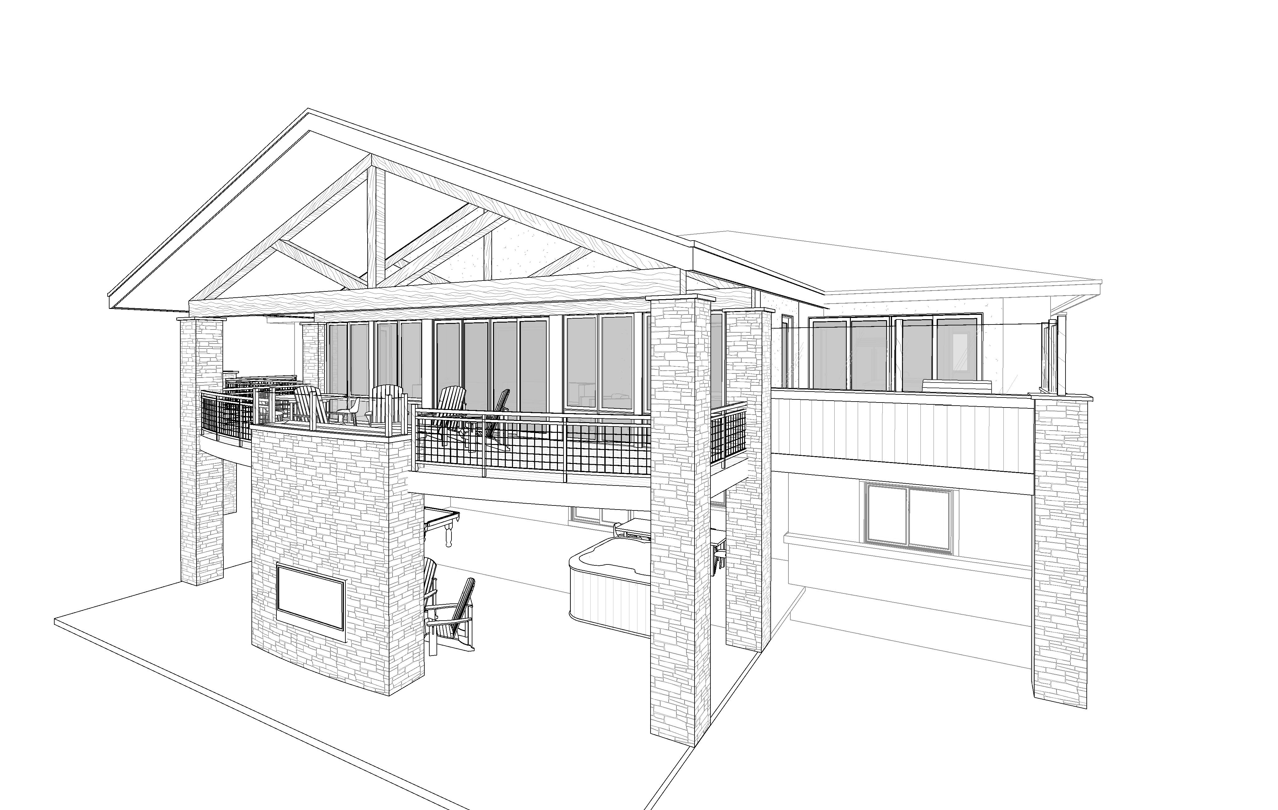 outdoor second floor deck sun room addition on stucco home in colorado front range foot hills trex wood decking wood timber trusses stucco stone tongue and groove ceiling