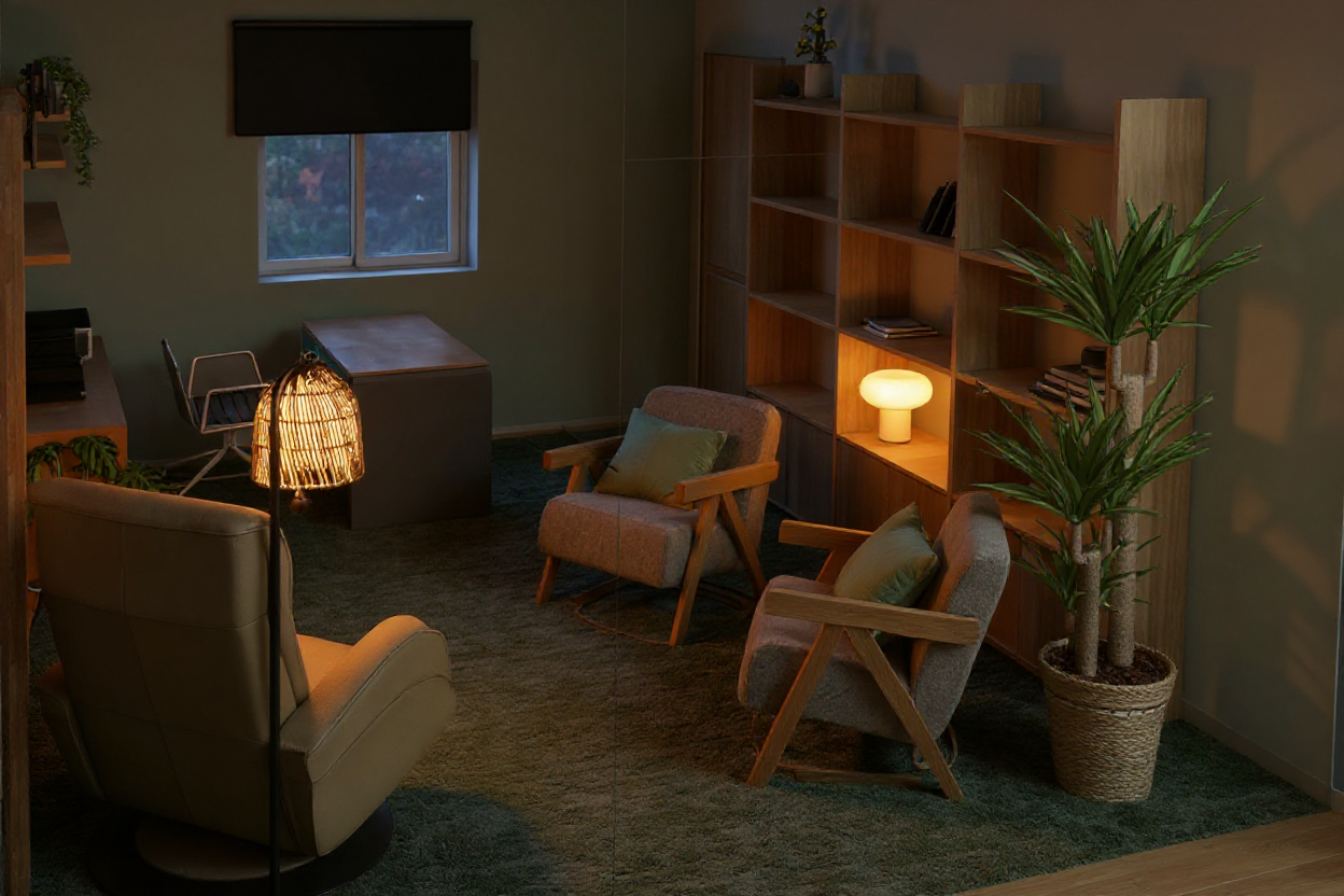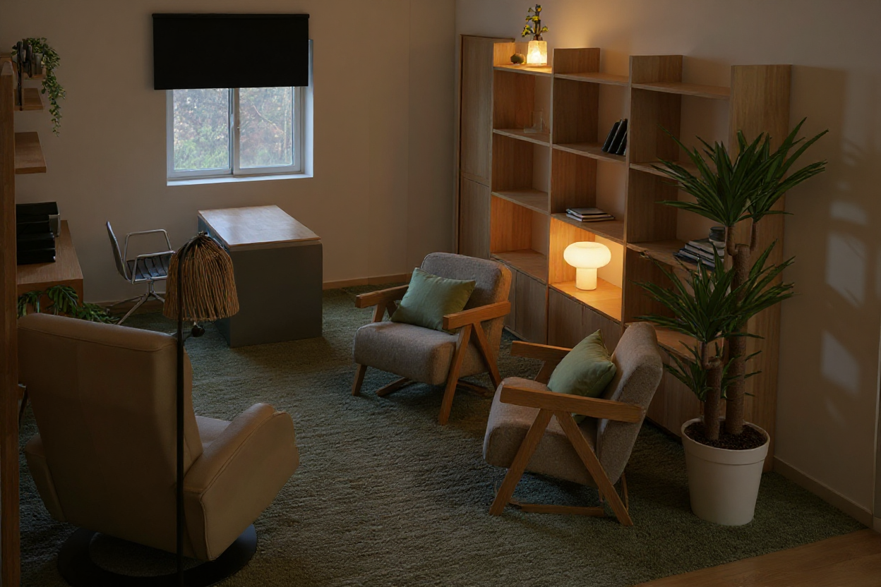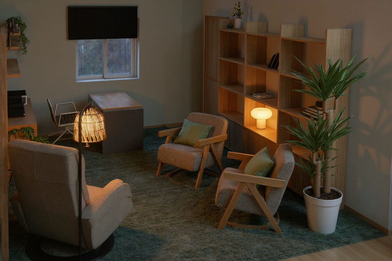 convert this floor plan into a realistic isometric 3d view of a office show the space from an elevated angle with furniture walls and details visible modern style offices with large format 120x120 cm flooring architectural concrete color and light ergonomic desks blue seat upholstery use the same furniture as shows on the plan do not change the orientation of the floorplan