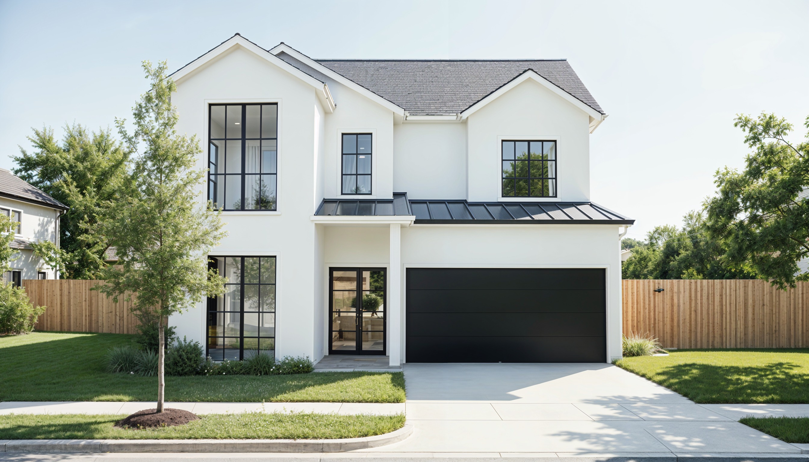 add a black electric wall mounted exterior light on the right side of the garage