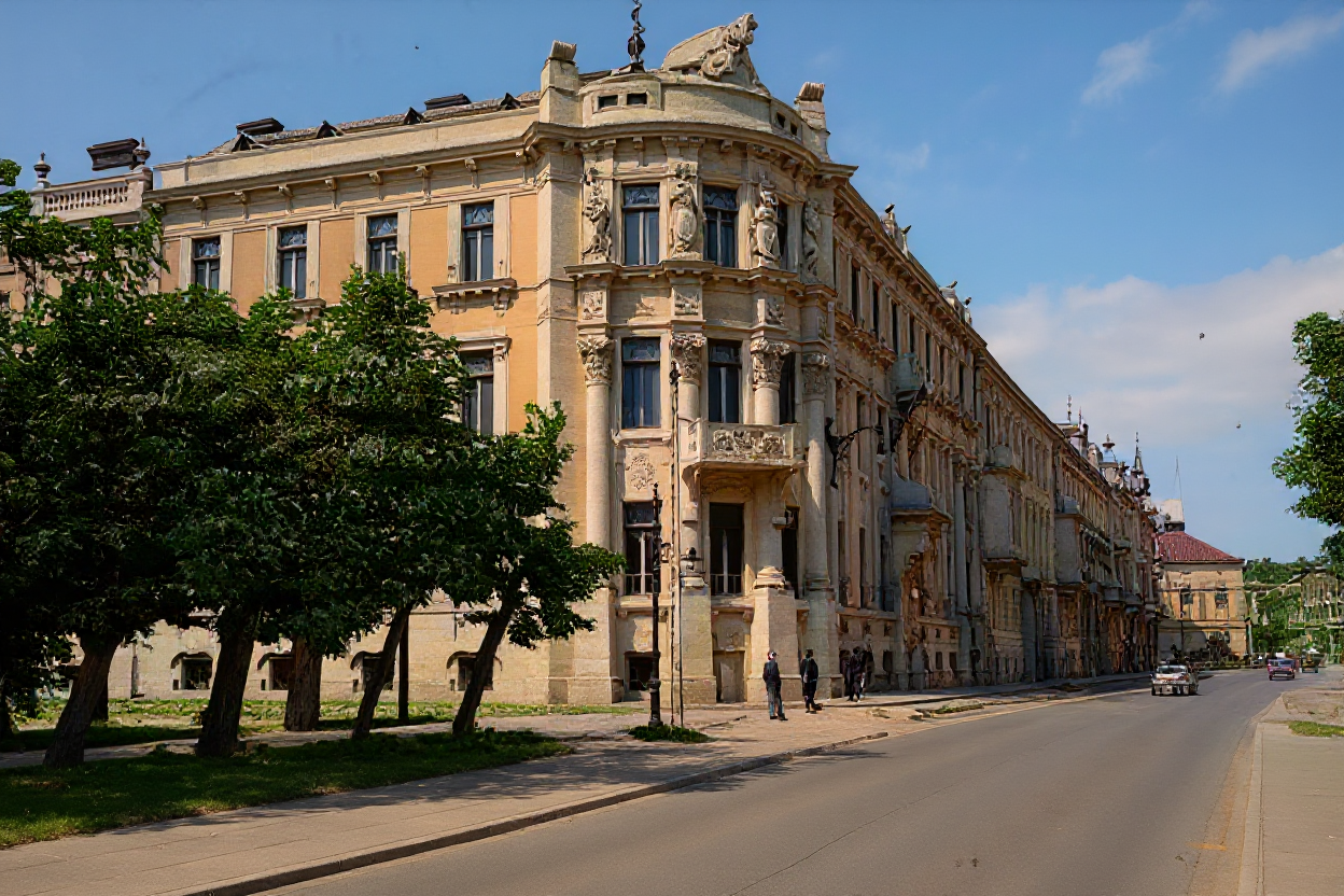sunny day from east more hyperlight cinematic realistic color rendering beautyful clouds 1900 s style dressing people coach cart with horses far away remove text from the picture paved road warm color stucco fassades