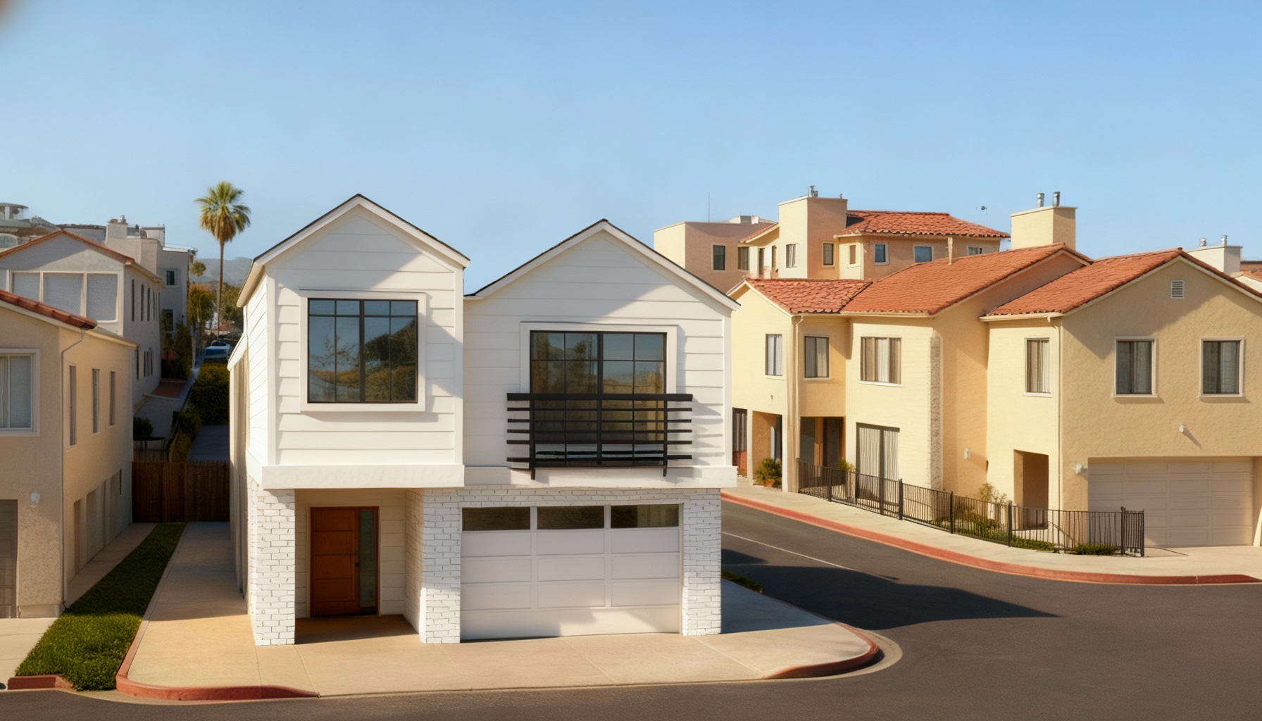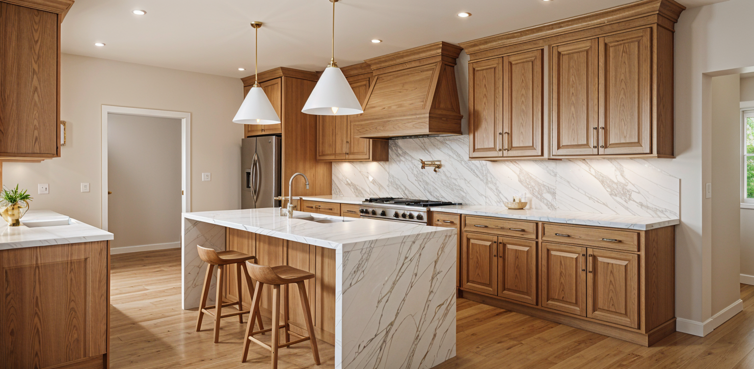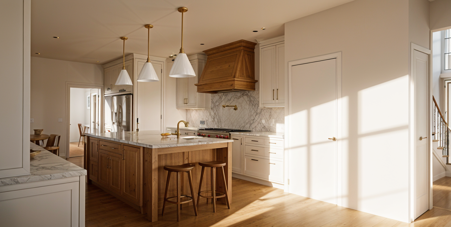 white kitchen with natural light and pale light white oak island and range hood keep geometry exactly the same