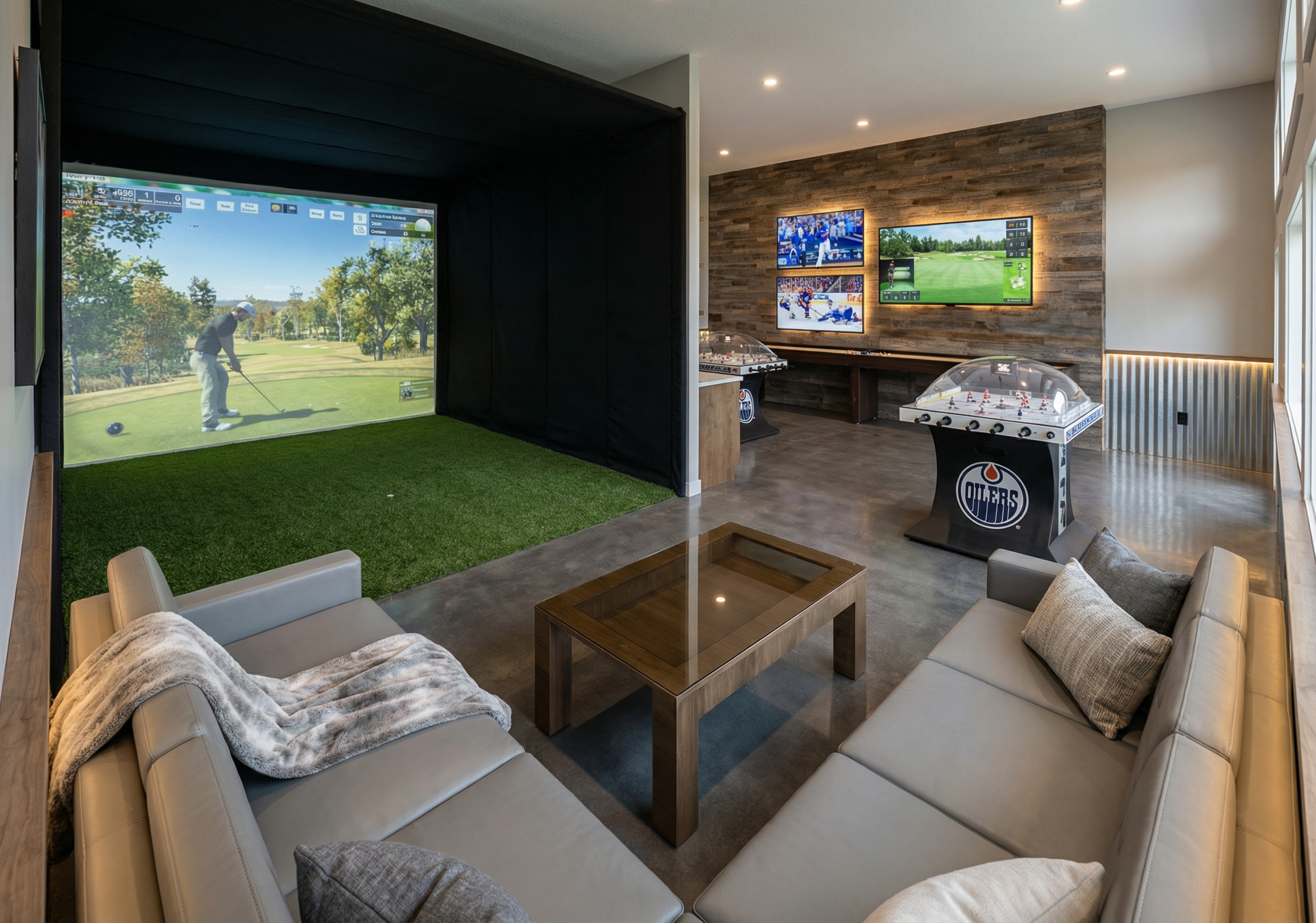 a modern rustic man cave games room the room contains a golf simulator with a hyper realistic grass floor do not add lighting in simulator area do not show a golf ball or hole in the green floor black fabric walls and roof with the back having a high definition projector image of the game display the sectional sofa is ultra realistic soft medium grey uber comfy leather like vinyl with complimenting cloth throw cushion decor and two soft throw blankets a coffee table with tinted glass top shuffleboard below the tv s nhl super chexx pro bubble hockey edmonton oilers black version including a black base and a oilers logo on the base 3 tv s on the feature tv wall the top tv is displaying a high definition blue jays baseball game the bottom tv is displaying a high definition edmonton oilers hockey game the large tv to the right is showing a high definition golf simulator game matching the projector image in the golf simulator all tv s are softly backlit around their perimeter the entire tv wall with 3 tv s is finished with horizontal medium large planks of rustic reclaimed wood do not backlight the rustic tv wall the bottom 42 of all exterior walls are finished in galvanized vertical corrugated metal capped at the top with a small wood sill that has led strip lighting underneath providing a soft lighting onto the corrugated metal no lighting at the bottom of the corrugated metal soft natural light coming through the windows and pot lights throughout providing gentle ambient soft mood lighting make all the wood for the table coffee table chairs and corrugated steel trim a medium dark wood grained birch the floor should be a medium dark gray cut and polished concrete floor do not add windows preserve the original image as a background plate keep everything else unchanged forbid geometry reconstruction
