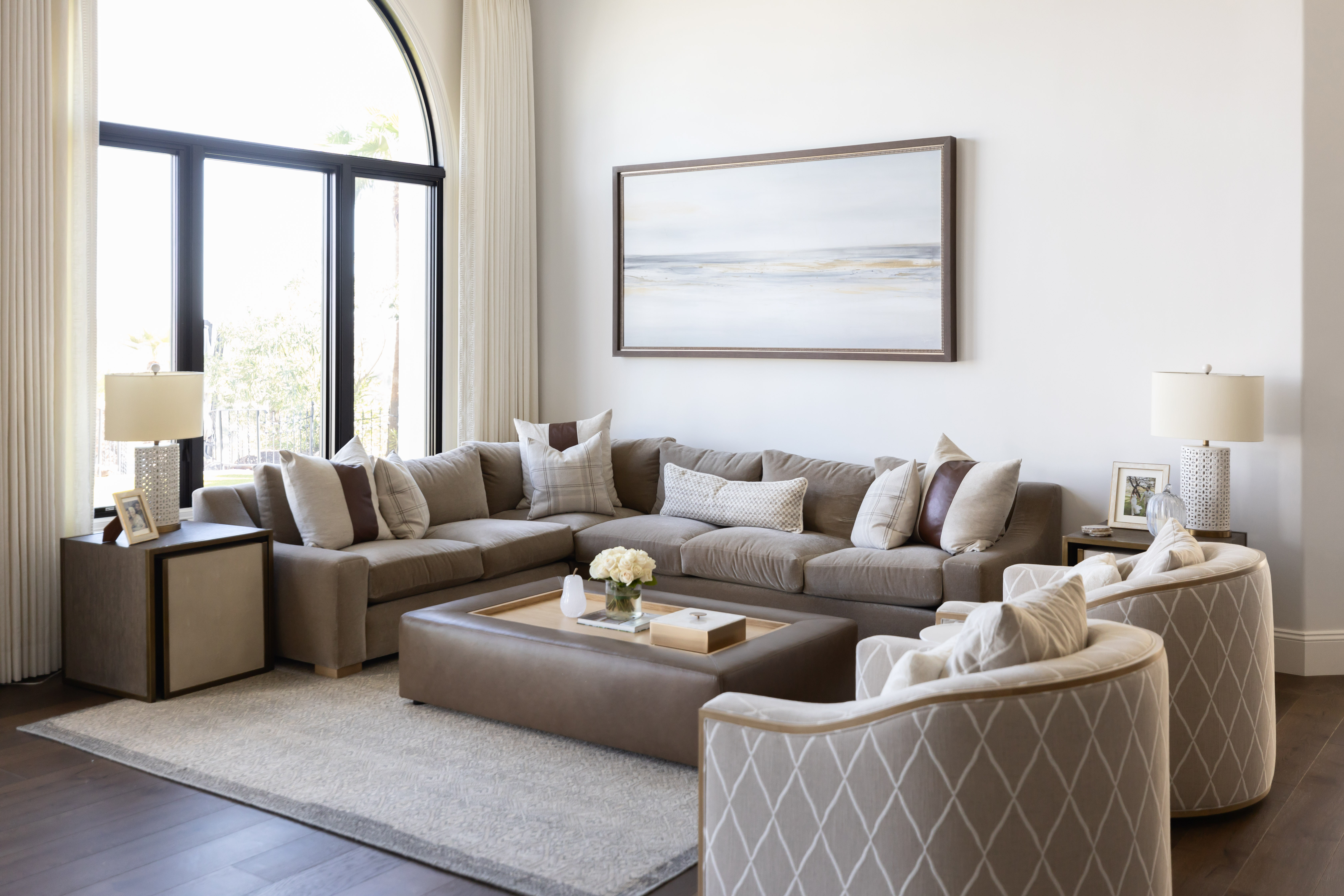 extend the rug under the bottom front part of the patterned swivel chairs leave everything else the same