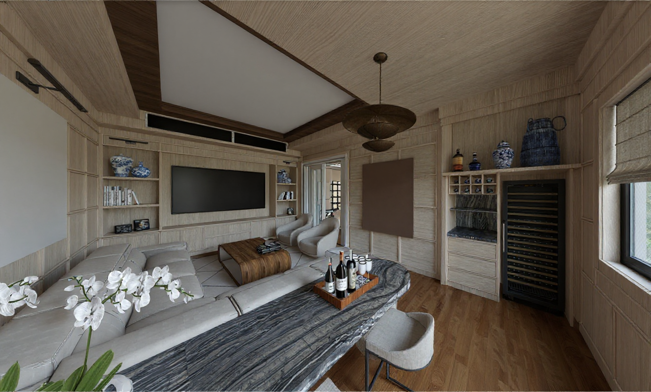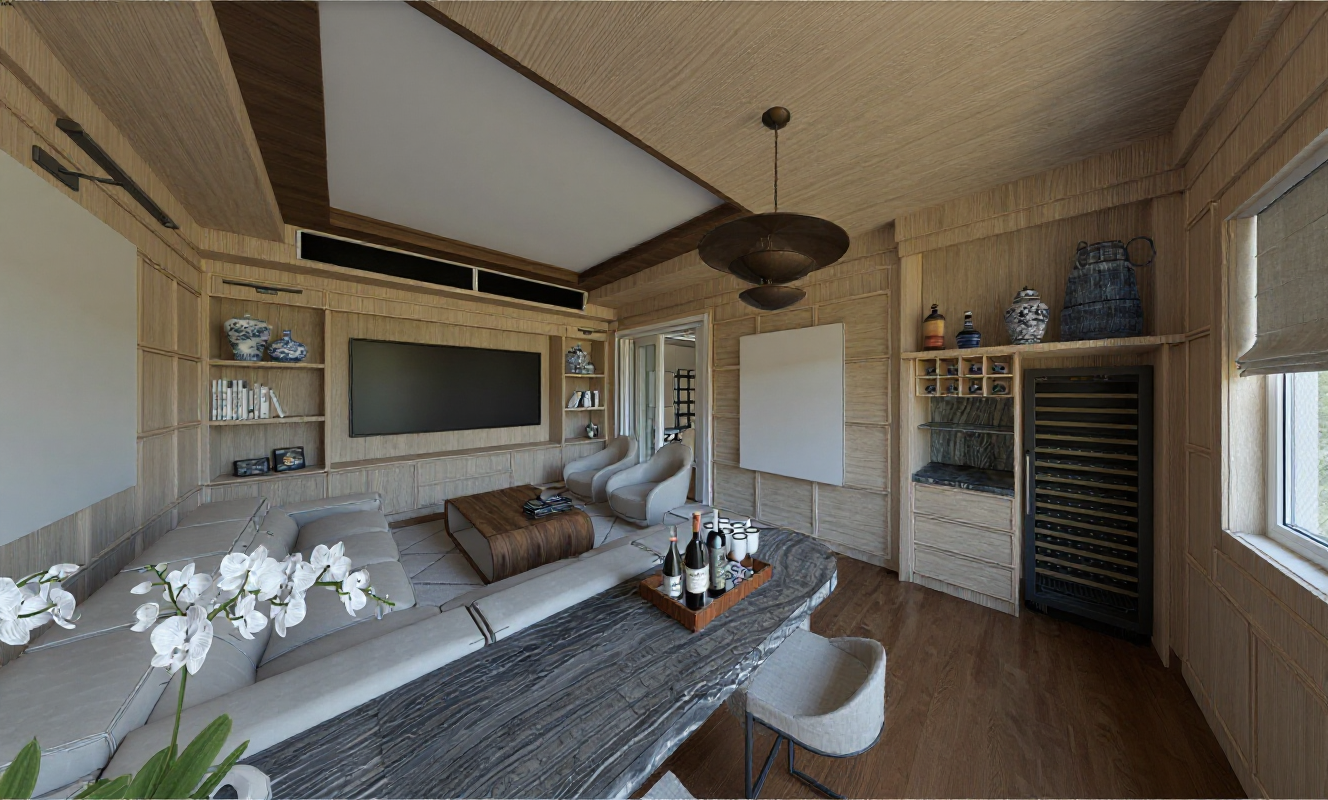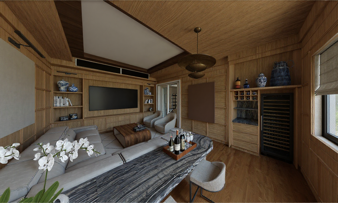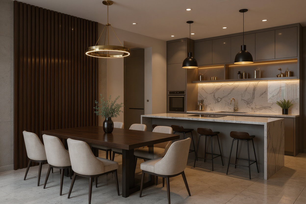 modernist interior shot render a modern area with a sophisticated and luxurious atmosphere use a soft warm ivory for the dining chairs create a cozy appeal and should be an elegant deep espresso brown giving it a rich look decorate the overhead chandelier with golden accents for a touch of luxury and a gentle warm glow the walls should be finished with a combination of matte white and textured gray panels for a contemporary feel incorporate a wooden partition with horizontal slats in dark walnut to balance the open space the kitchen counter should feature a sleek marble surface in a blend of whites and soft grays complemented by stainless steel fixtures for a modern touch use recessed ceiling lights and pendant lights in black and gold to provide soft ambient lighting add subtle green plants and metallic decor items on the shelves for a hint of color and style the overall atmosphere should be a mix of modern sophistication and inviting warmth architecture