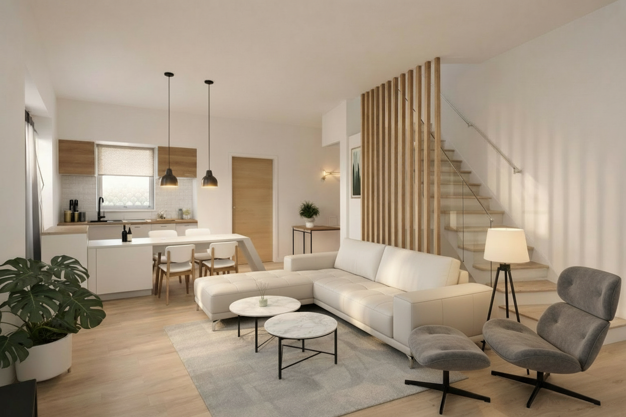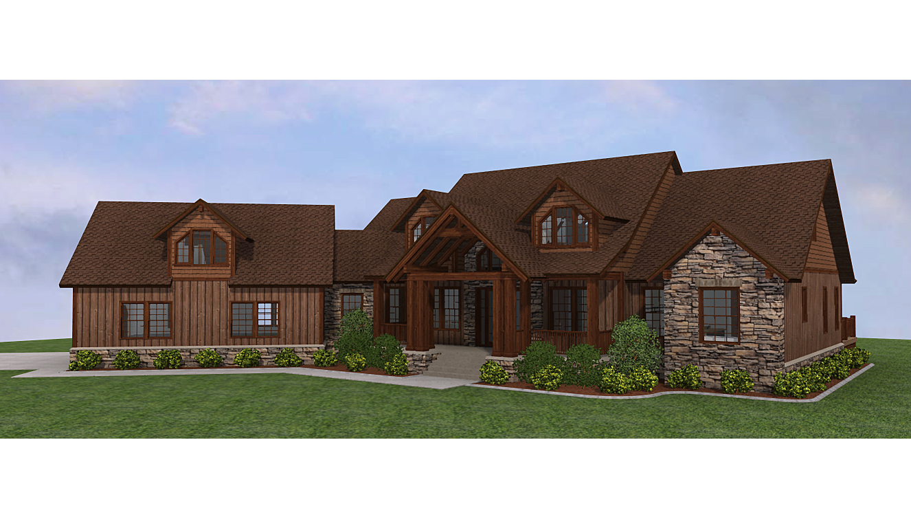 a modern house retain the exact structure colors and window arrangement rooflines siding foundation height and proportions exactly as shown in the reference image integrate into the terrain there are just a few trees mixed hardwoods that are mostly on the sides of the image add cooler afternoon sunlight subtle dappled highlights across the siding and grass create ultra realistic lighting crisp shadows detailed textures in the siding and glass reflections and an overcast sky show only a few lights visible inside render in hyper realistic architectural visualization quality 8k resolution add a driveway tying into the concrete garage door apron make it the fall season add realistic landscape